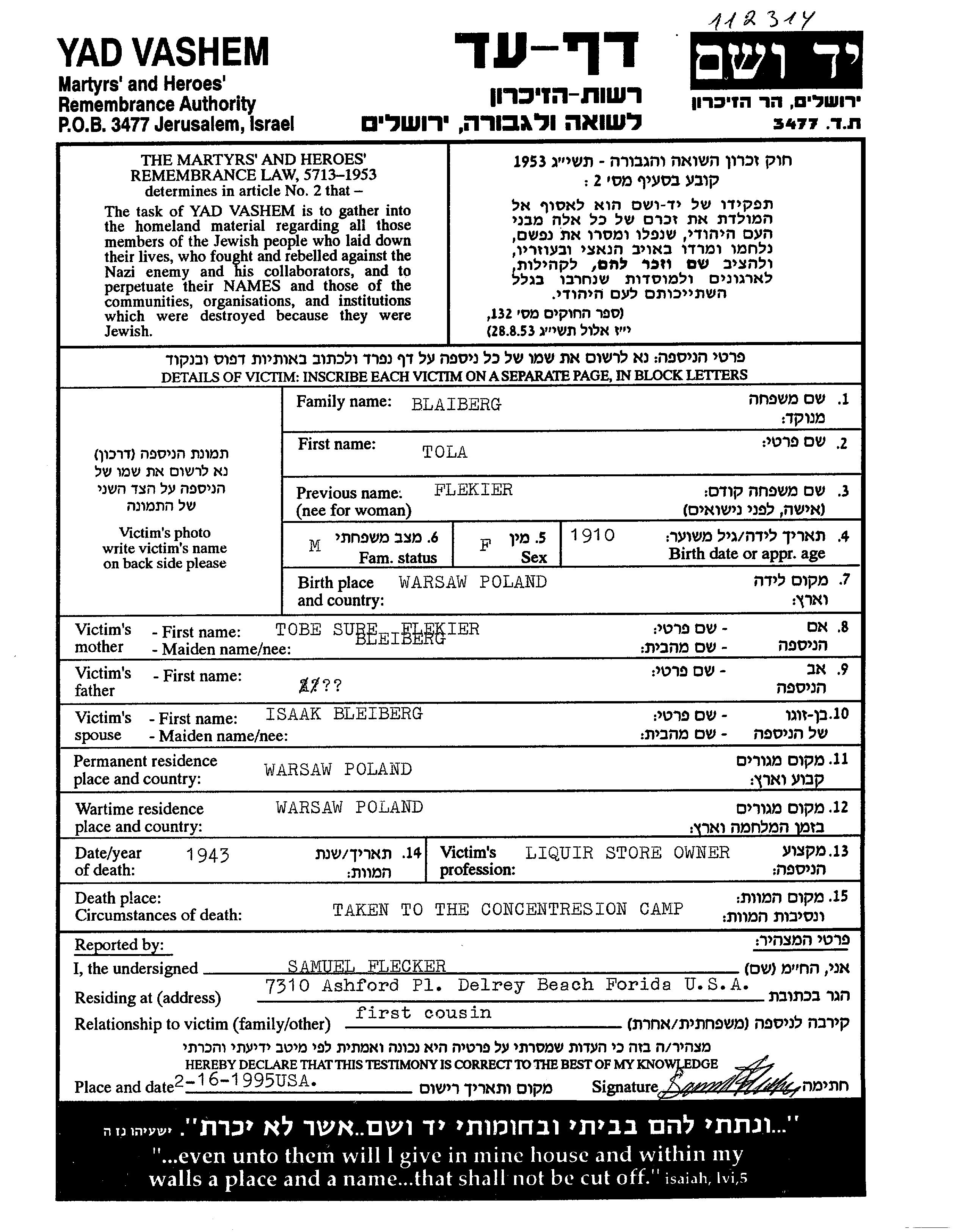 טולה Tola Blaiberg לבית Flekier נולדה בWarszawa שבפולין בשנת 1910 לTobe Sure טובה. היא היתה סוחרת ונשואה לIsaak. לפני מלחמת העולם השניה התגוררה בWarszawa שבפולין. בזמן המלחמה היא היתה בWarszawa שבפולין.