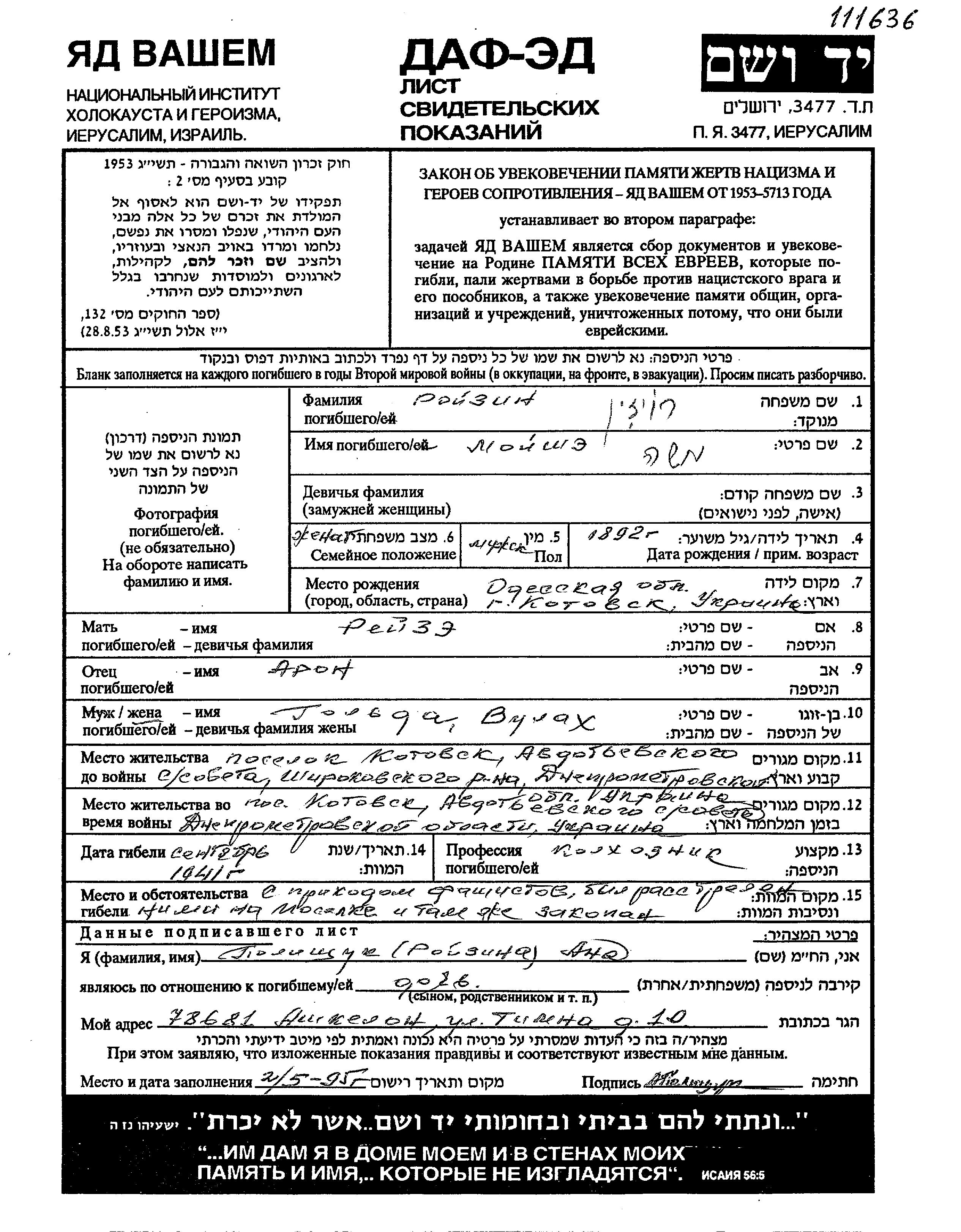 Moishe Royzin נולד בKotovsk שבאוקראינה (ברה"מ) בשנת 1892 לארון וReize. הוא היה חקלאי ונשוי לגולדה. לפני מלחמת העולם השניה התגורר בKotovskoye שבאוקראינה (ברה"מ). בזמן המלחמה הוא היה בKotovskoye שבאוקראינה (ברה"מ). הוא נרצח בשואה. מקום המוות: Kotovskoye שבאוקראינה (ברה"מ) בשנת 1941.