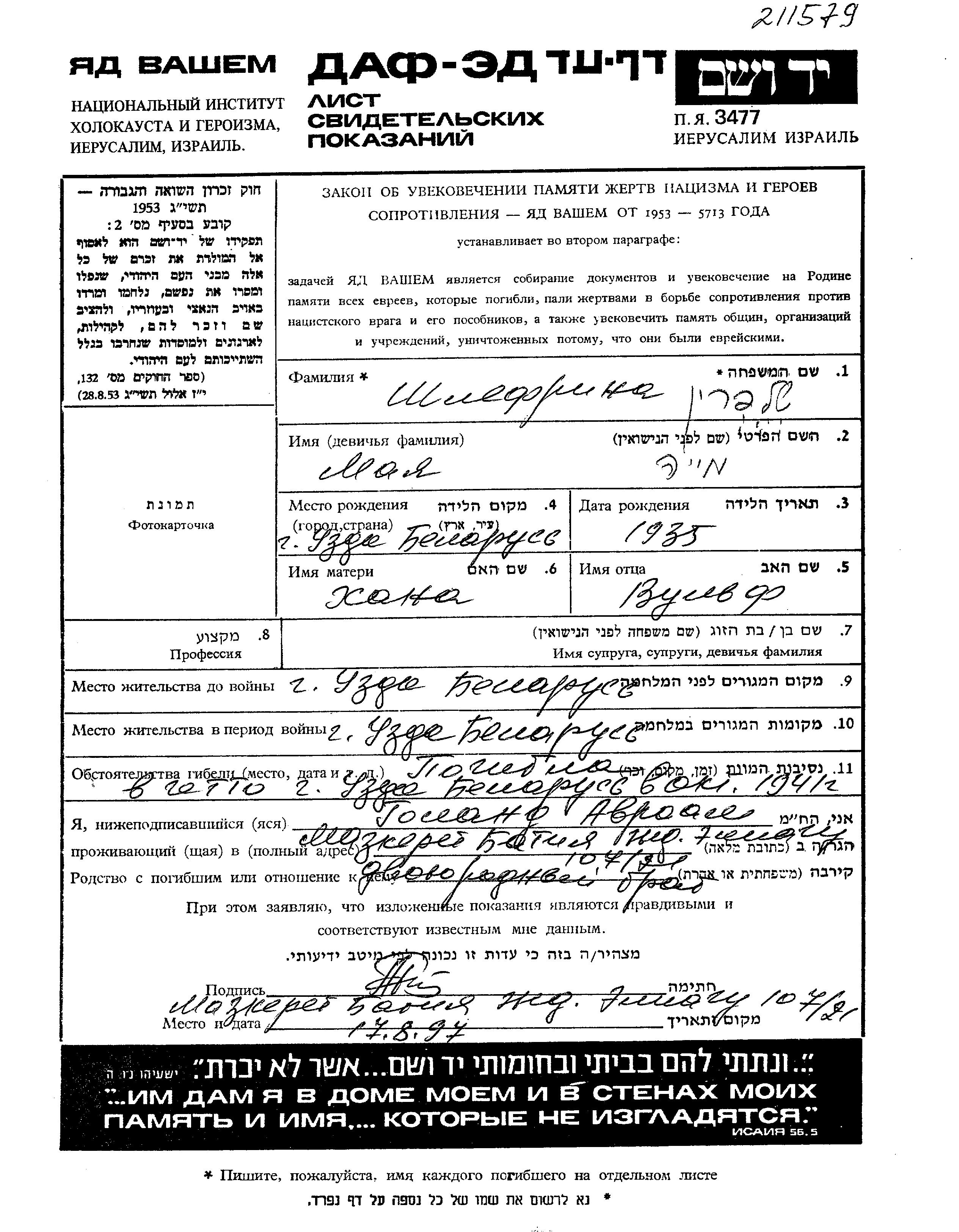 Maya Shlefrina נולדה בUzda שבביאלורוסיה (ברה"מ) בשנת 1935 לVulf וחנה. היא היתה תלמידה וילדה. לפני מלחמת העולם השניה התגוררה בUzda שבביאלורוסיה (ברה"מ). בזמן המלחמה היא היתה בUzda שבביאלורוסיה (ברה"מ).