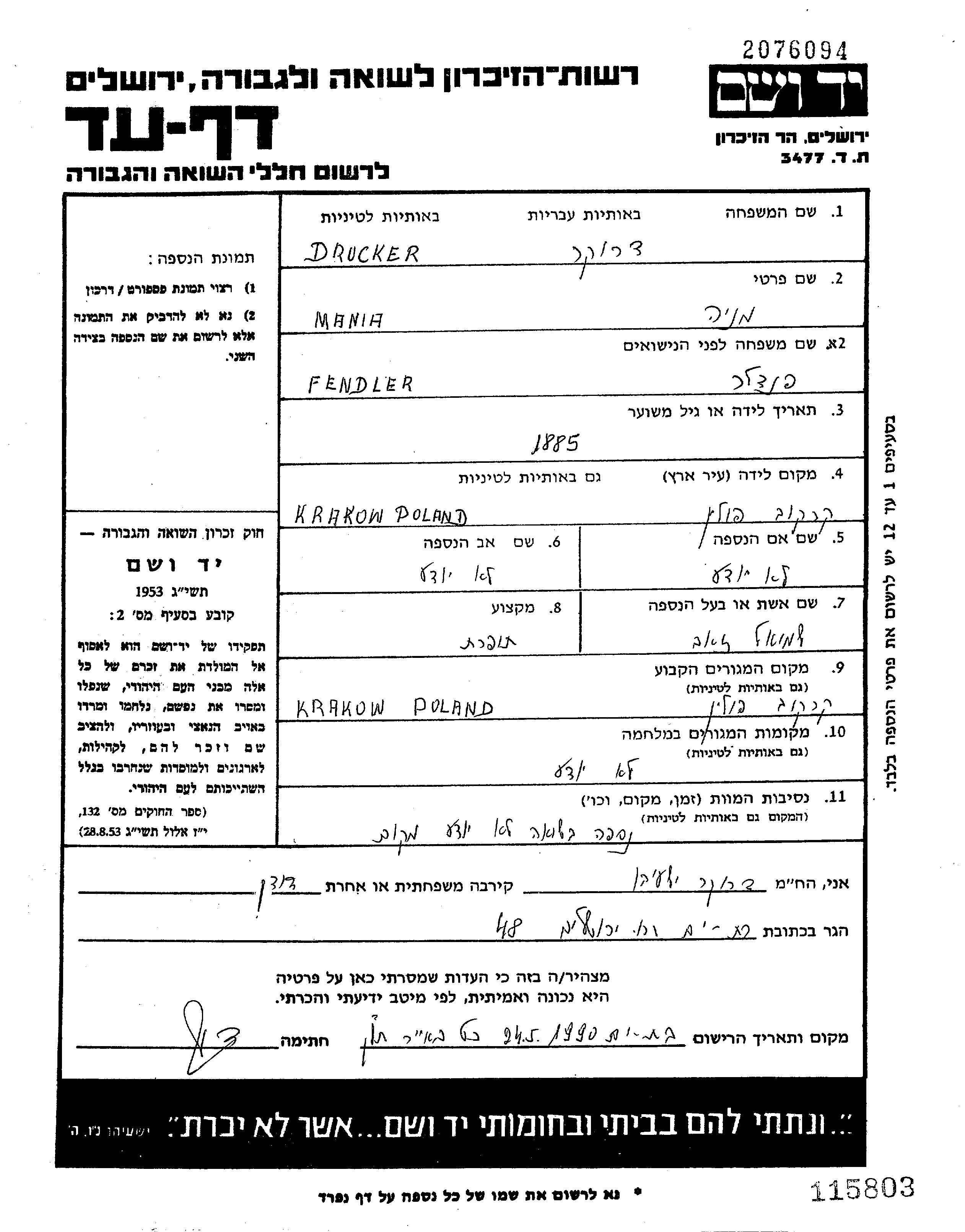 מניה Drucker לבית פנדלר נולדה בKrakow שבפולין. היא היתה תופרת ונשואה לשמואל זאב. לפני מלחמת העולם השניה התגוררה בKrakow שבפולין.