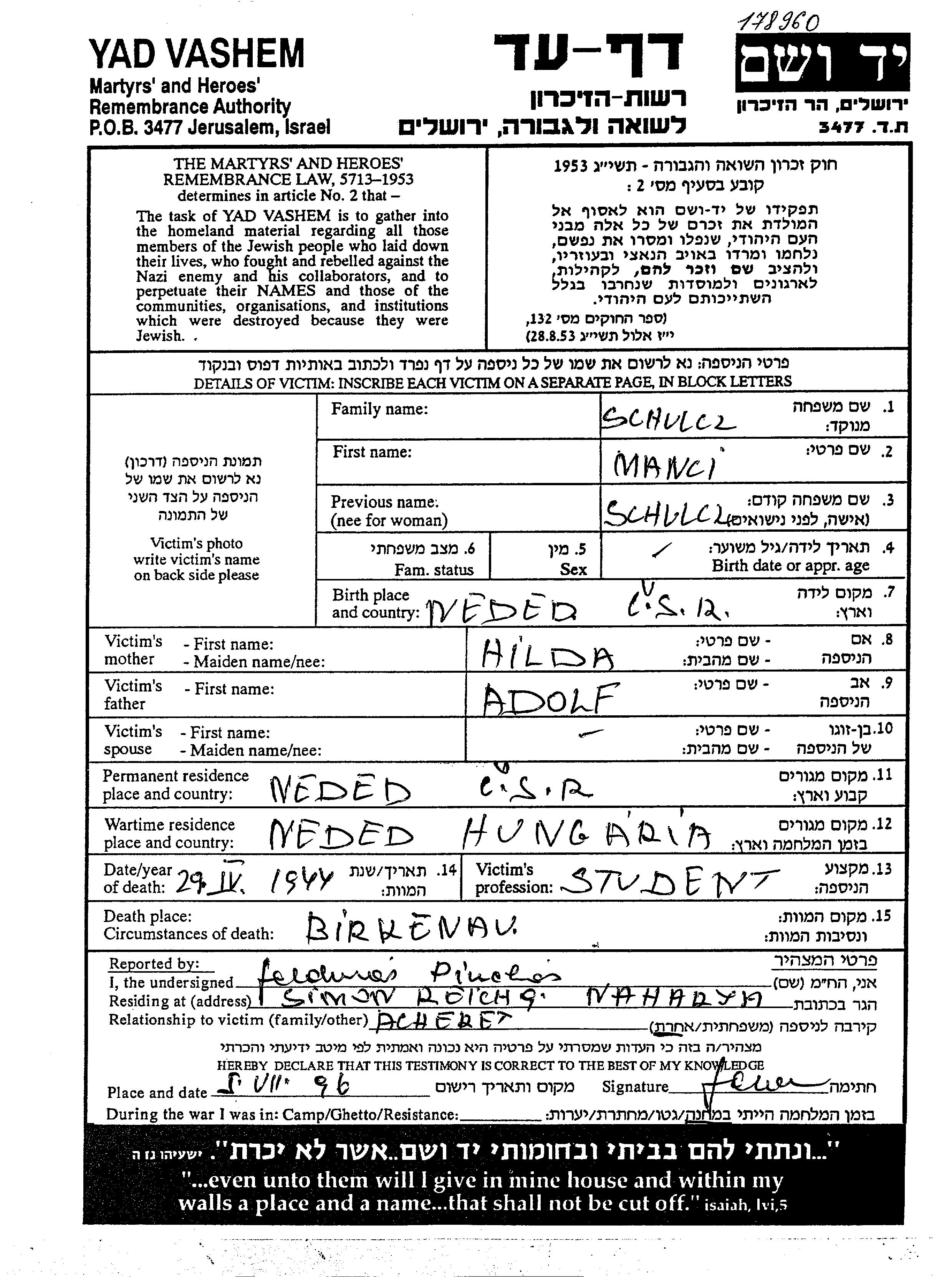 Manci Schulcz נולדה בNeded שבצ'כוסלובקיה לאדולף והילדה. היא היתה סטודנטית ורווקה. לפני מלחמת העולם השניה התגוררה בNeded שבצ'כוסלובקיה. בזמן המלחמה היא היתה בNeded שבצ'כוסלובקיה. היא נרצחה בשואה. מקום המוות: Birkenau שבפולין בשנת 29/04/1944.