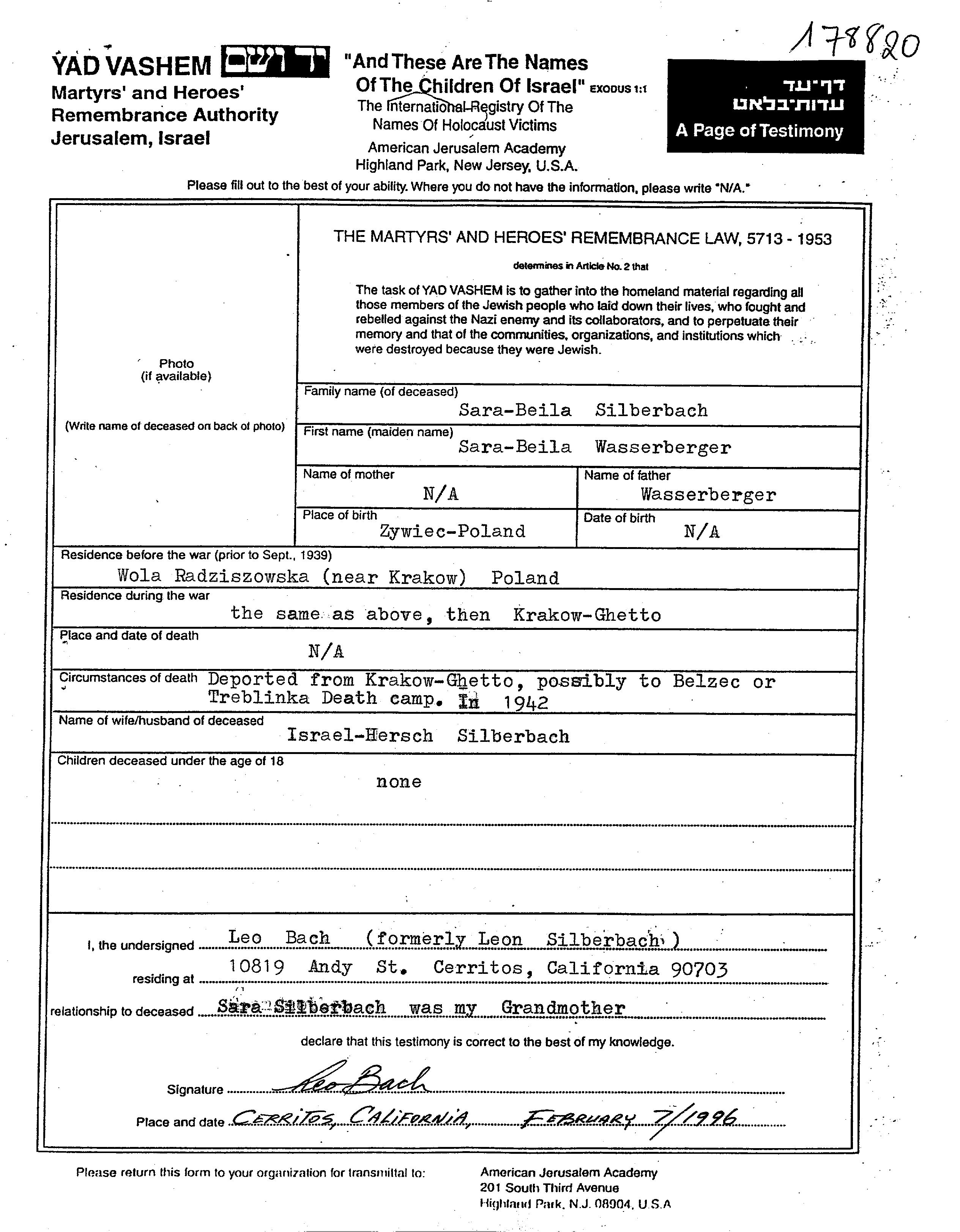 Beila שרה Silberbach לבית Wasserberger נולדה בZywiec שבפולין. היא היתה נשואה לIsrael Hersch. לפני מלחמת העולם השניה התגוררה בWola Radziszowska שבפולין. בזמן המלחמה היא היתה בKrakow שבפולין.