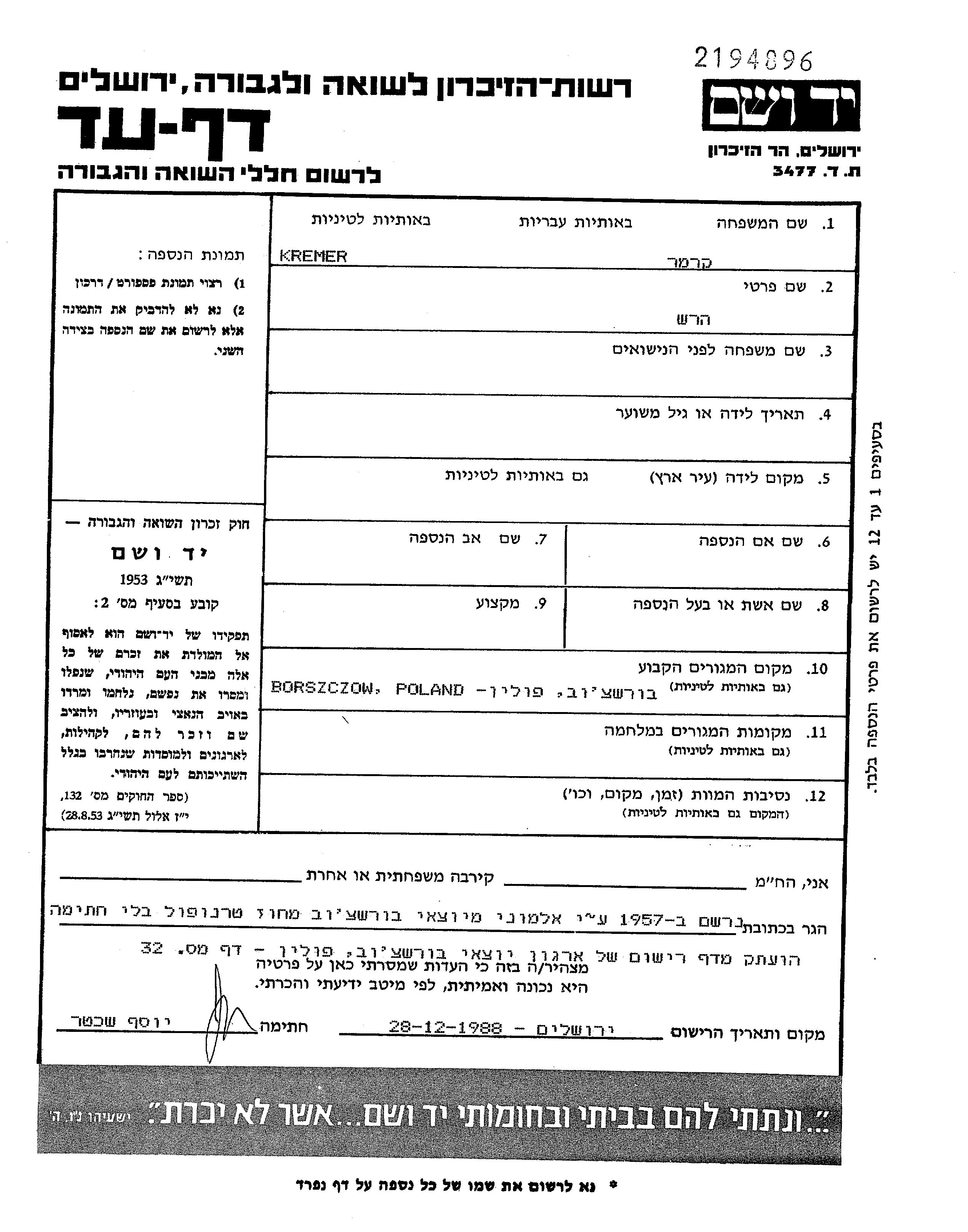 קרמר הרש Borszczow, פולין דף-עד