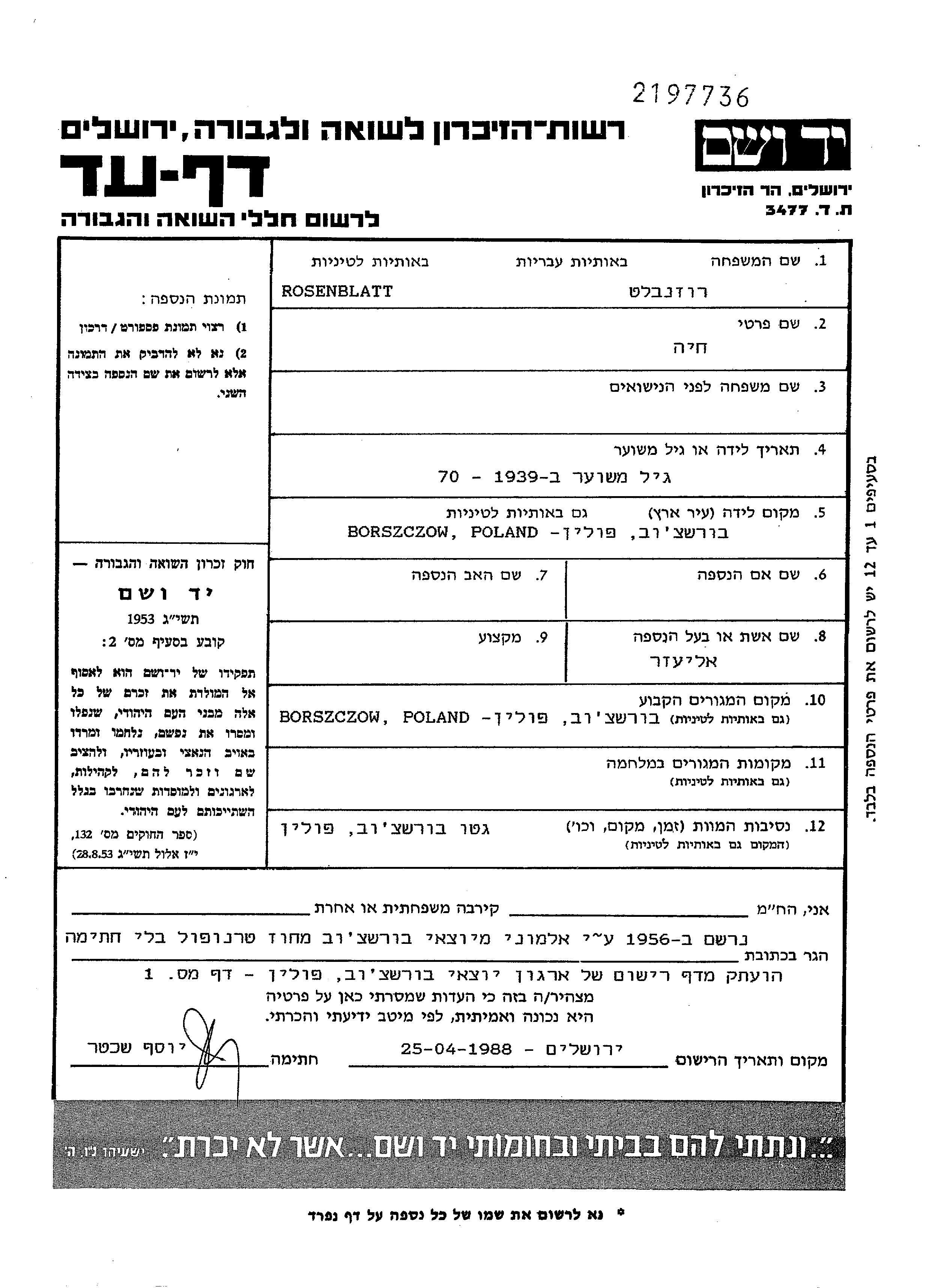 חיה Rosenblatt נולדה בBorszczow שבפולין. היא היתה נשואה לאליעזר. לפני מלחמת העולם השניה התגוררה בBorszczow שבפולין.