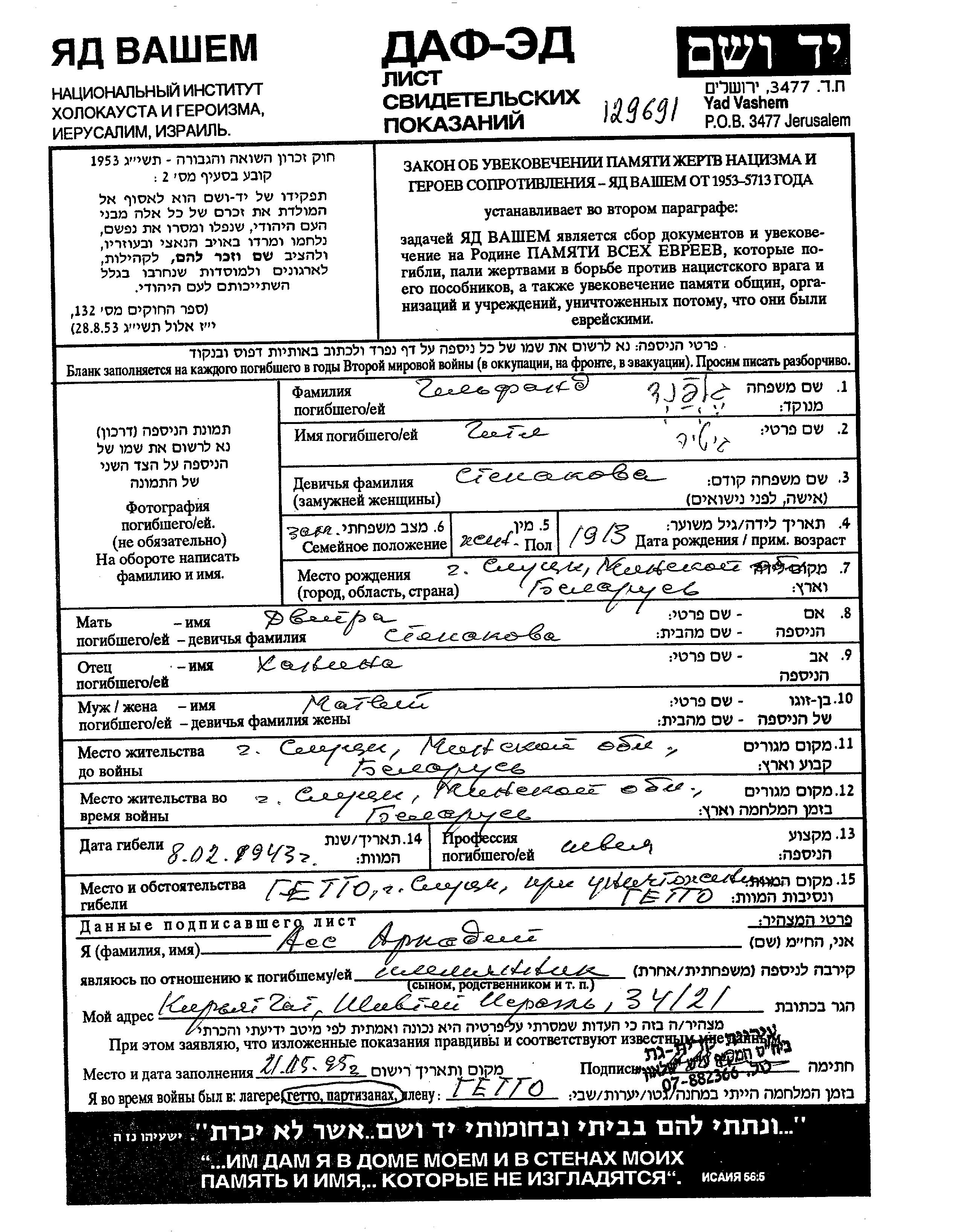 חיפוש שם מוסר דף העד. חיפוש לפי כל שם פרטי, כולל כינוי או שם חיבה