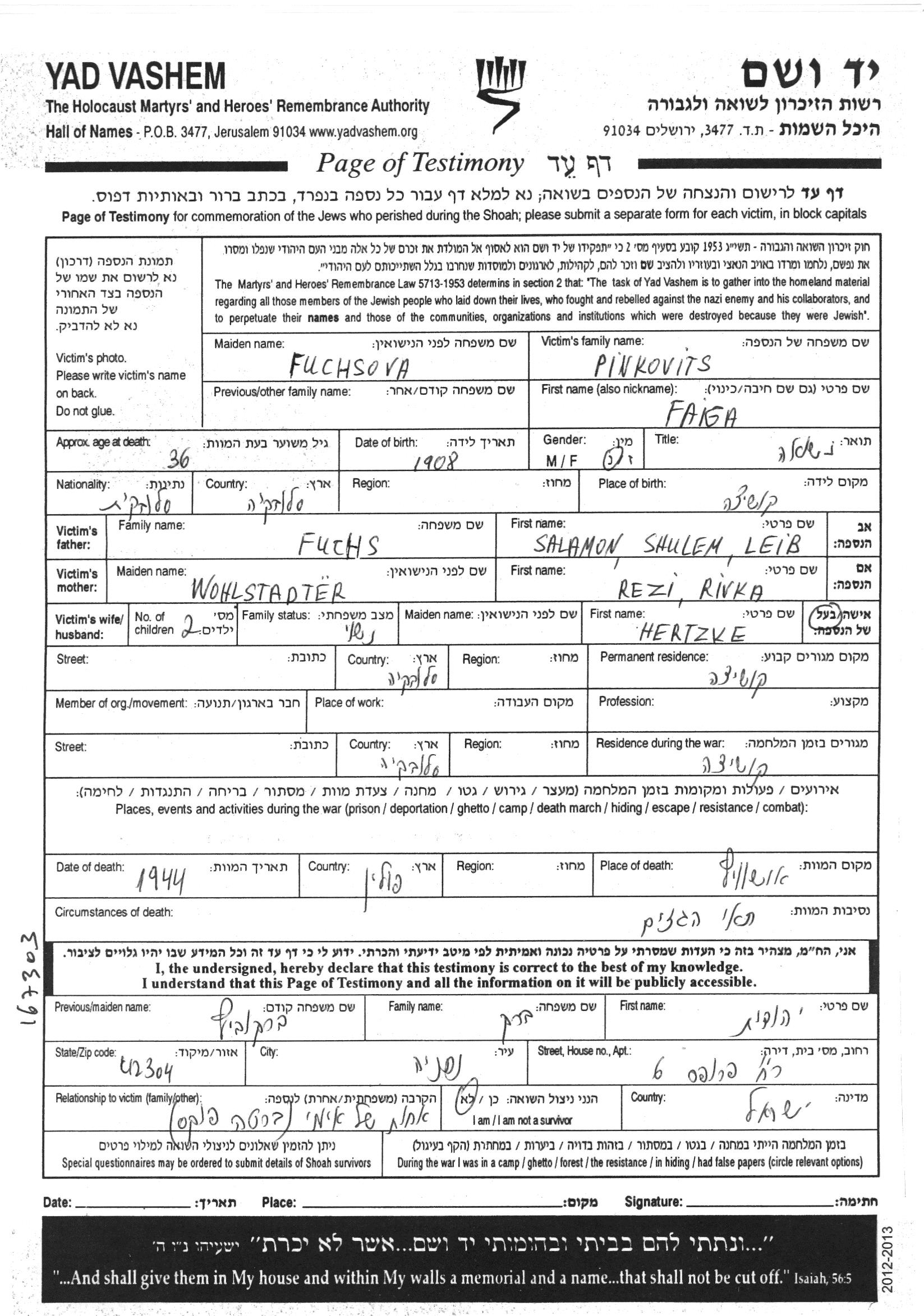 Faiga Pinkovits לבית Fuchsova נולדה בKosice שבצ'כוסלובקיה בשנת 1908 לסלמון שולם לייב ורבקה Rezi לבית Wohlstadter. היא היתה נשואה לHertzke. לפני מלחמת העולם השניה התגוררה בKosice שבצ'כוסלובקיה. בזמן המלחמה היא היתה בKosice שבצ'כוסלובקיה. היא נרצחה בשואה. מקום המוות: Auschwitz שבפולין בשנת 01/01/1944.