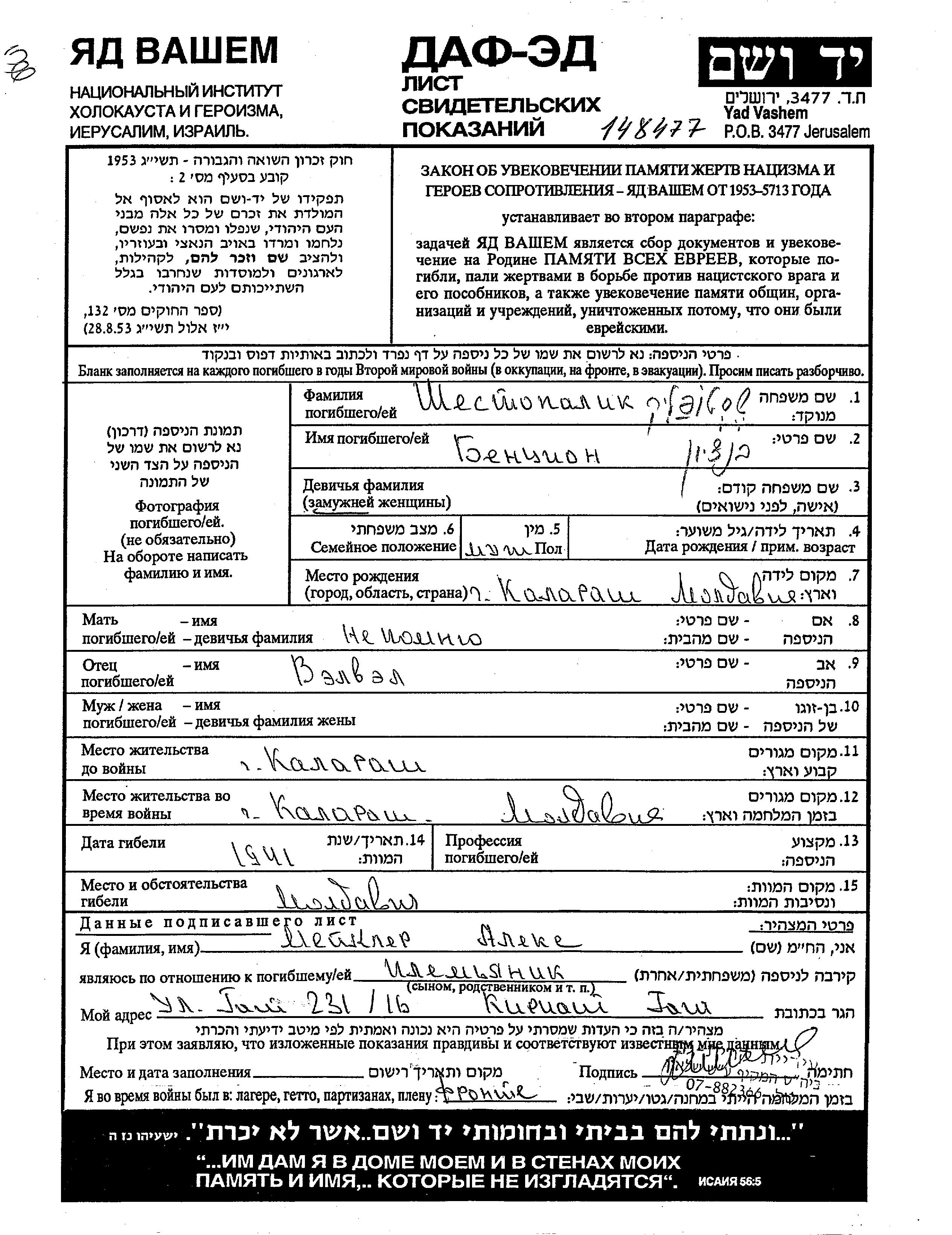 בן ציון נרצח בשואה. מקום המוות: Moldavia שבאוקראינה (ברה"מ) בשנת 1941.