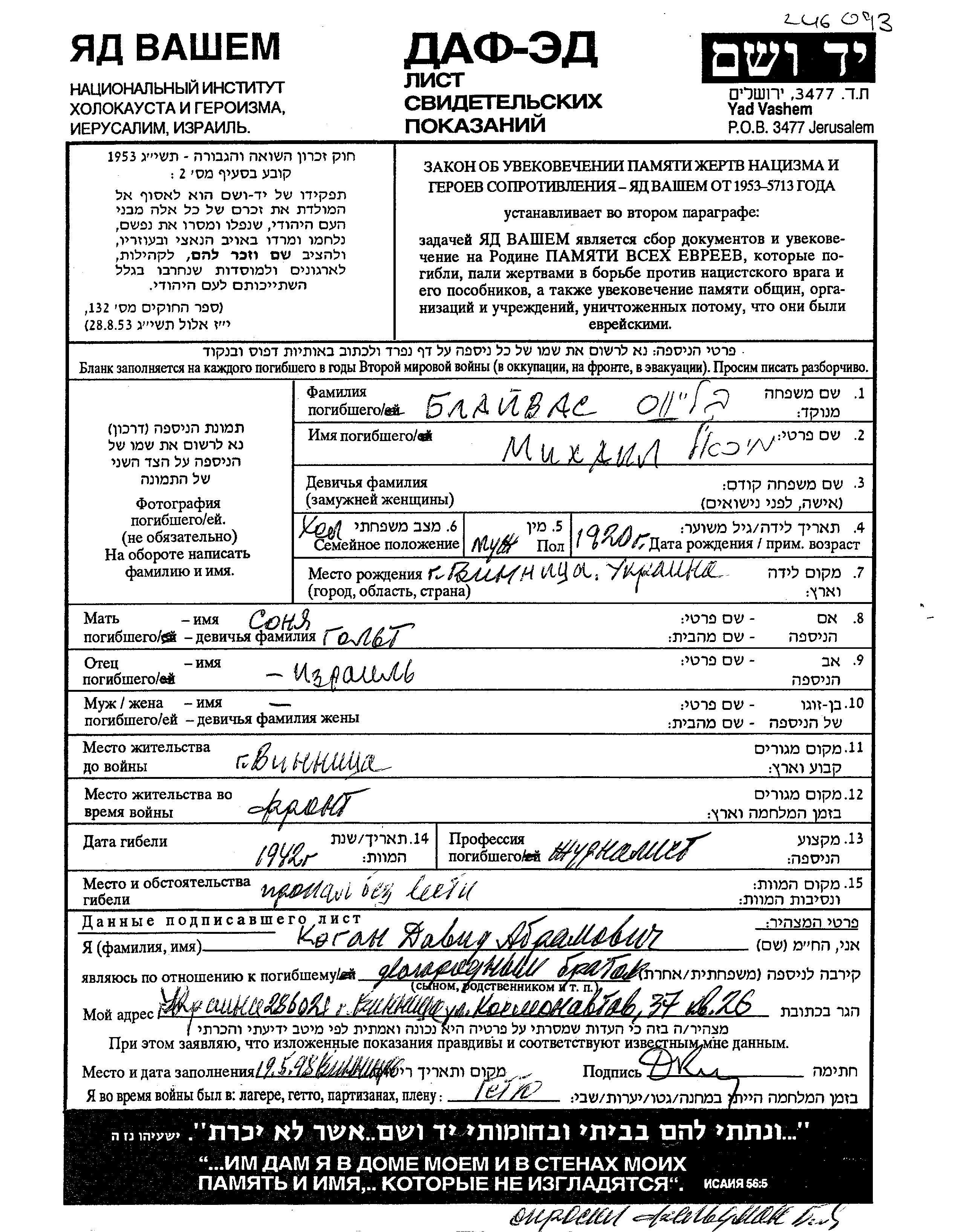 Mikhail Blaivas נולד בVinnitsa שבאוקראינה (ברה"מ) בשנת 1920 לIzrail וSonya לבית Golt. הוא היה עיתונאי ורווק. לפני מלחמת העולם השניה התגורר בVinnitsa שבאוקראינה (ברה"מ). בזמן המלחמה הוא היה בצבא הסובייטי.