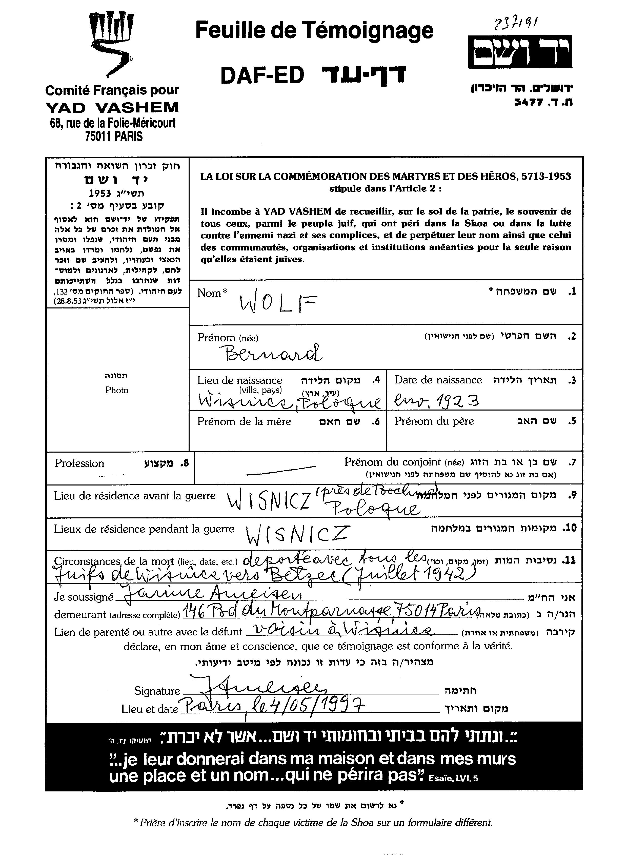 ברנרד Wolf נולד בWisnicz שבפולין בשנת 1923. לפני מלחמת העולם השניה התגורר בWisnicz שבפולין. בזמן המלחמה הוא היה בWisnicz שבפולין. ברנרד נרצח בשואה. מקום המוות: Belzec שבפולין בשנת 1942.