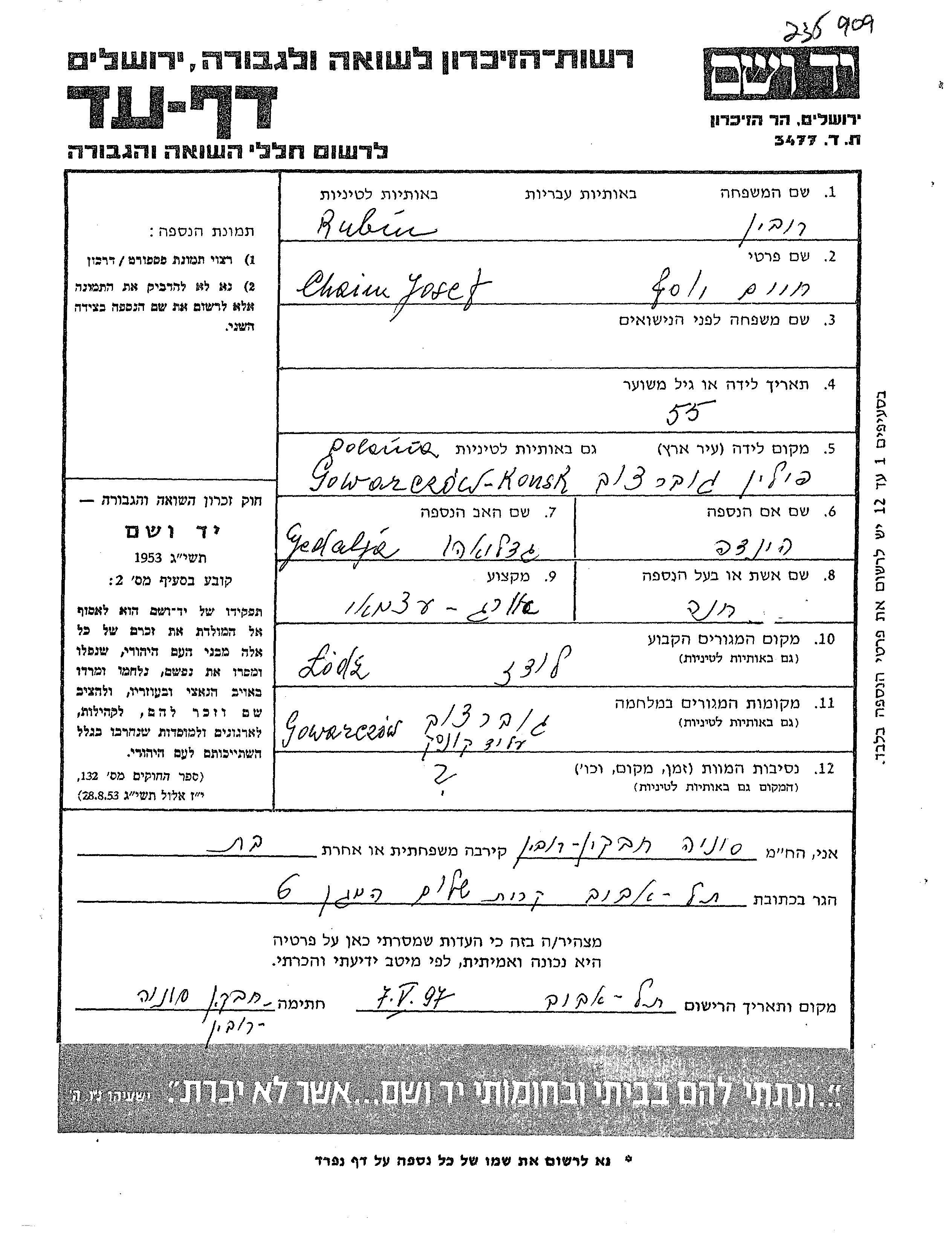 חיים Josef רובין נולד בGowarczow שבפולין לGedalja והינדה. הוא היה עצמאי ונשוי לחנה. לפני מלחמת העולם השניה התגורר בLodz שבפולין. בזמן המלחמה הוא היה בGowarczow שבפולין. חיים Josef נרצח בשואה.