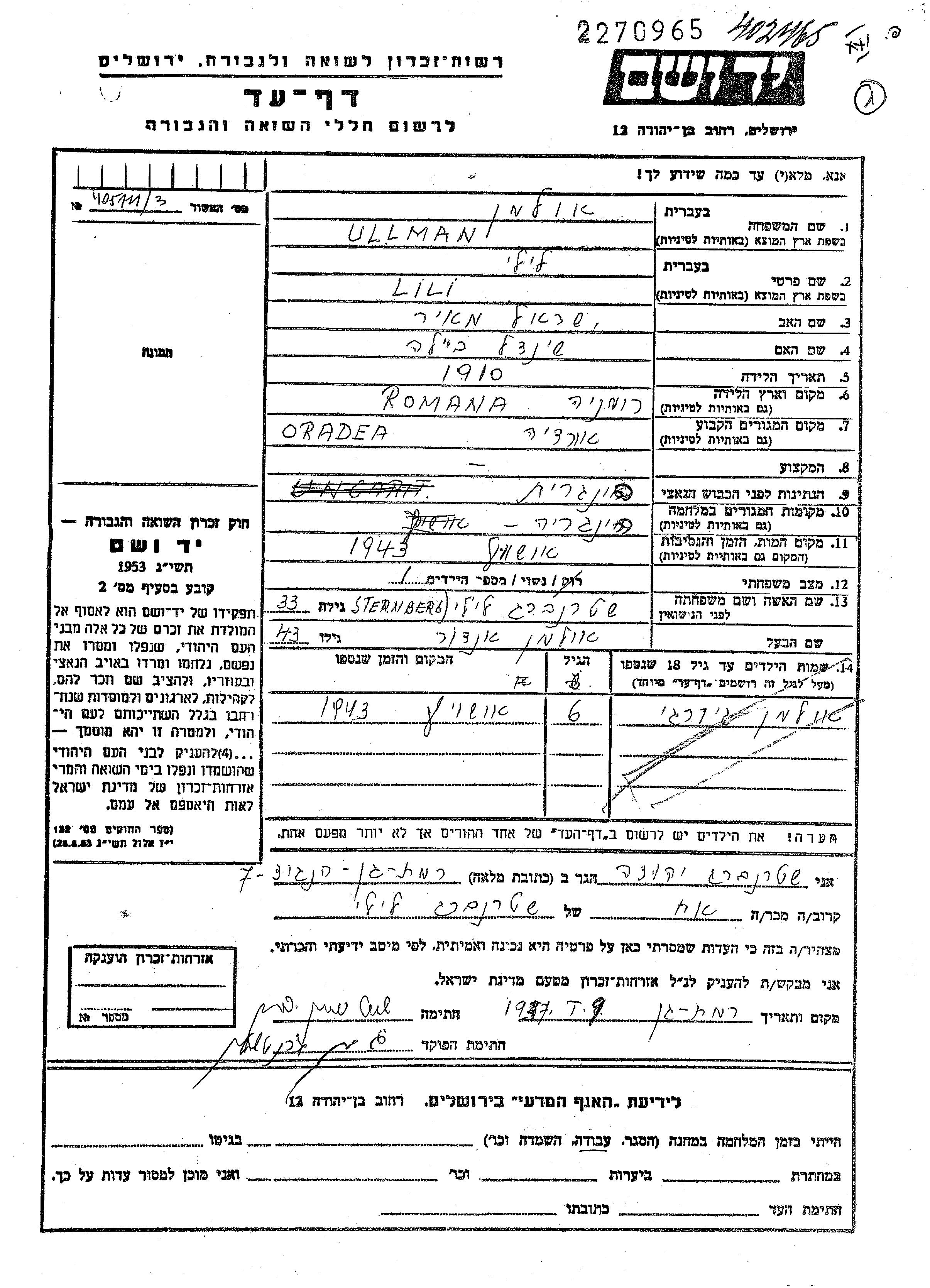 לילי Ullman לבית Sternberg נולדה ברומניה שברומניה בשנת 1910 לIsrael מאיר ושיינדל Beila. היא היתה נשואה לאנדור. לפני מלחמת העולם השניה התגוררה בOradea שברומניה. בזמן המלחמה היא היתה בהונגריה שבהונגריה. לילי נרצחה בשואה. מקום המוות: Auschwitz שבפולין בשנת 1943.