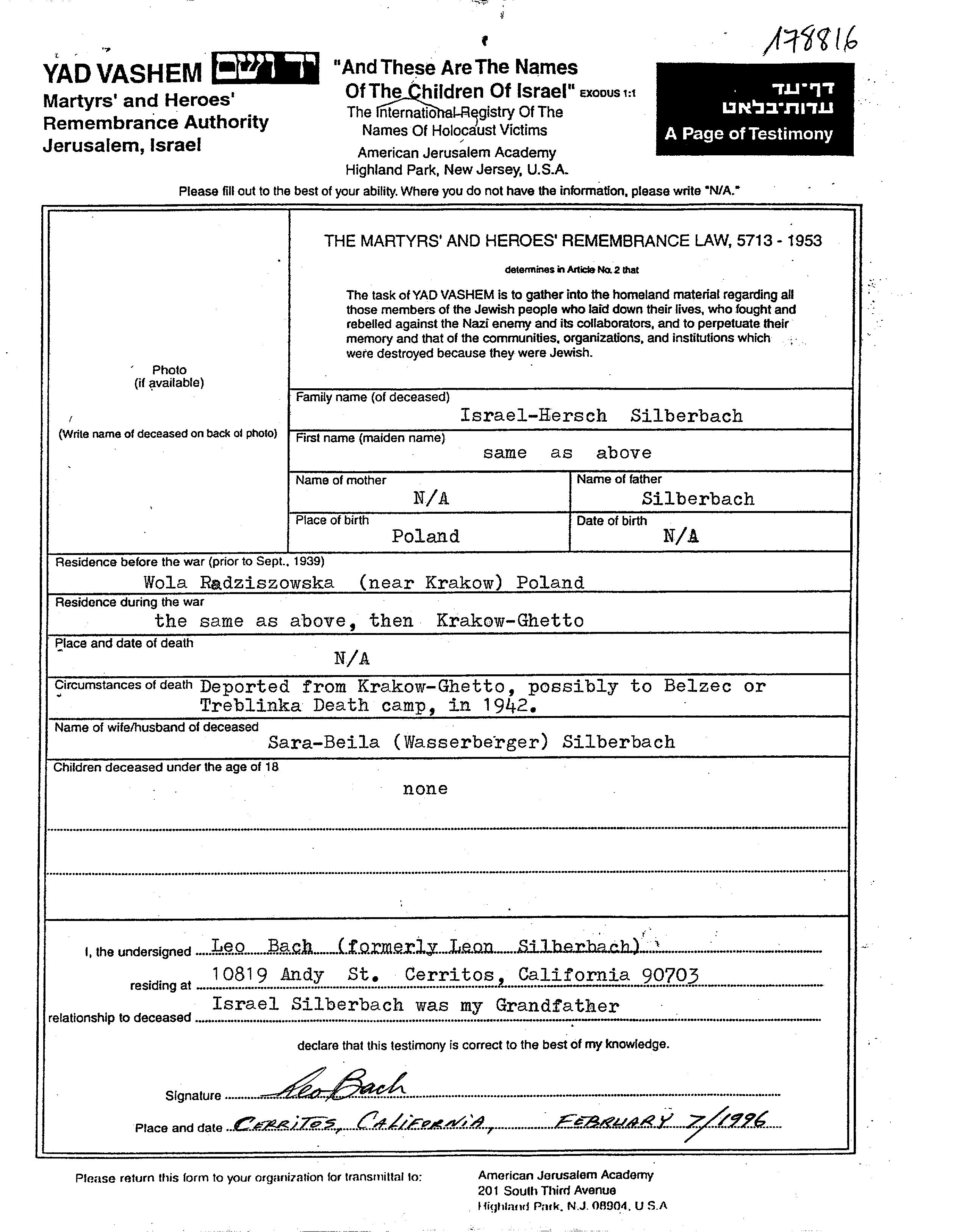 Israel Hersch Silberbach נולד בWola Radziszowska שבפולין. הוא היה נשוי לBeila שרה. לפני מלחמת העולם השניה התגורר בפולין שבפולין. בזמן המלחמה הוא היה בKrakow שבפולין. הוא נרצח בשואה. מקום המוות: Belzec שבפולין בשנת 1942.