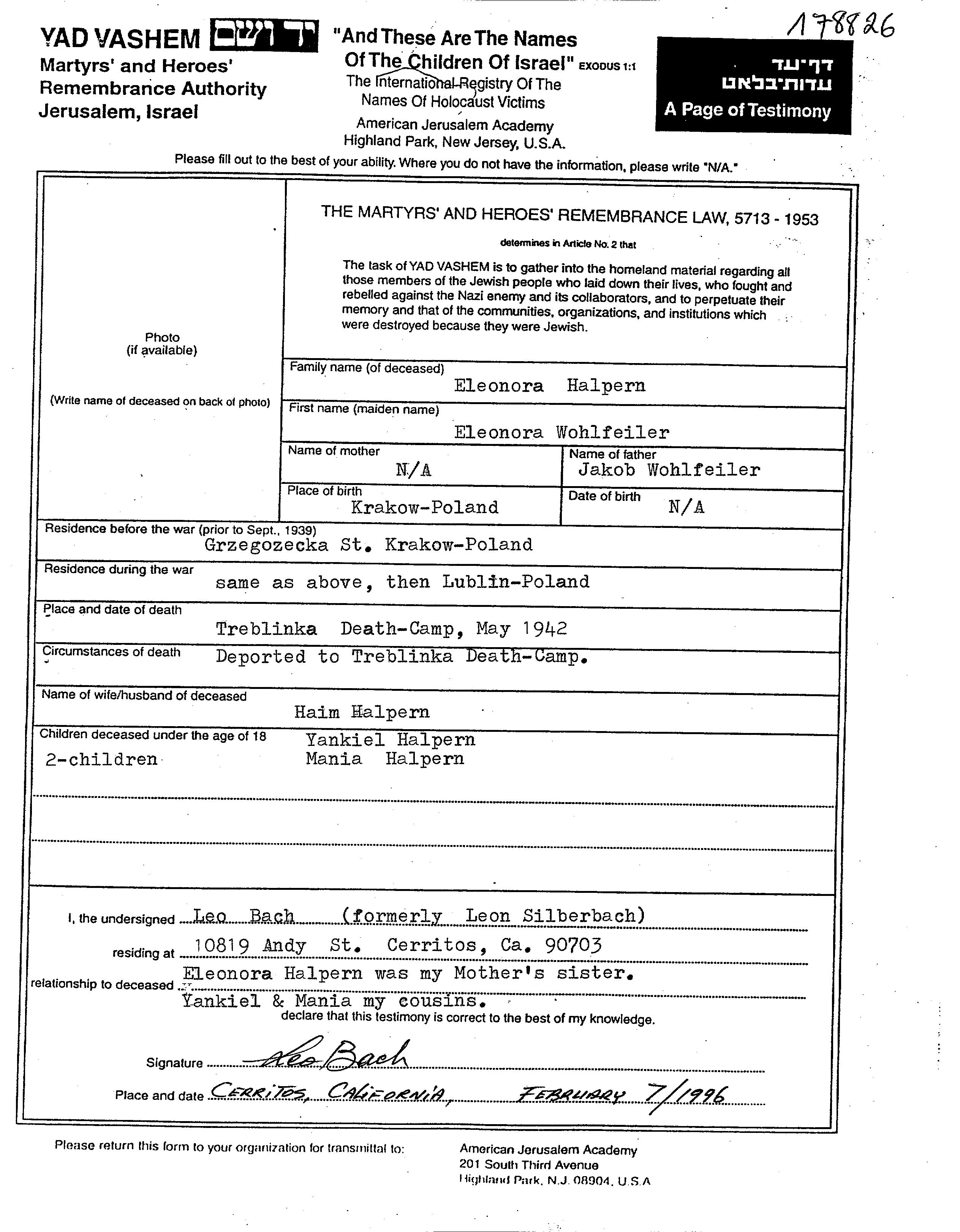 אלאונורה הלפרן לבית Wohlfeiler נולדה בKrakow שבפולין לJakob. היא היתה נשואה לHaim. לפני מלחמת העולם השניה התגוררה בKrakow שבפולין. בזמן המלחמה היא היתה בLublin שבפולין. אלאונורה נרצחה בשואה. מקום המוות: Treblinka שבפולין בשנת 1942.