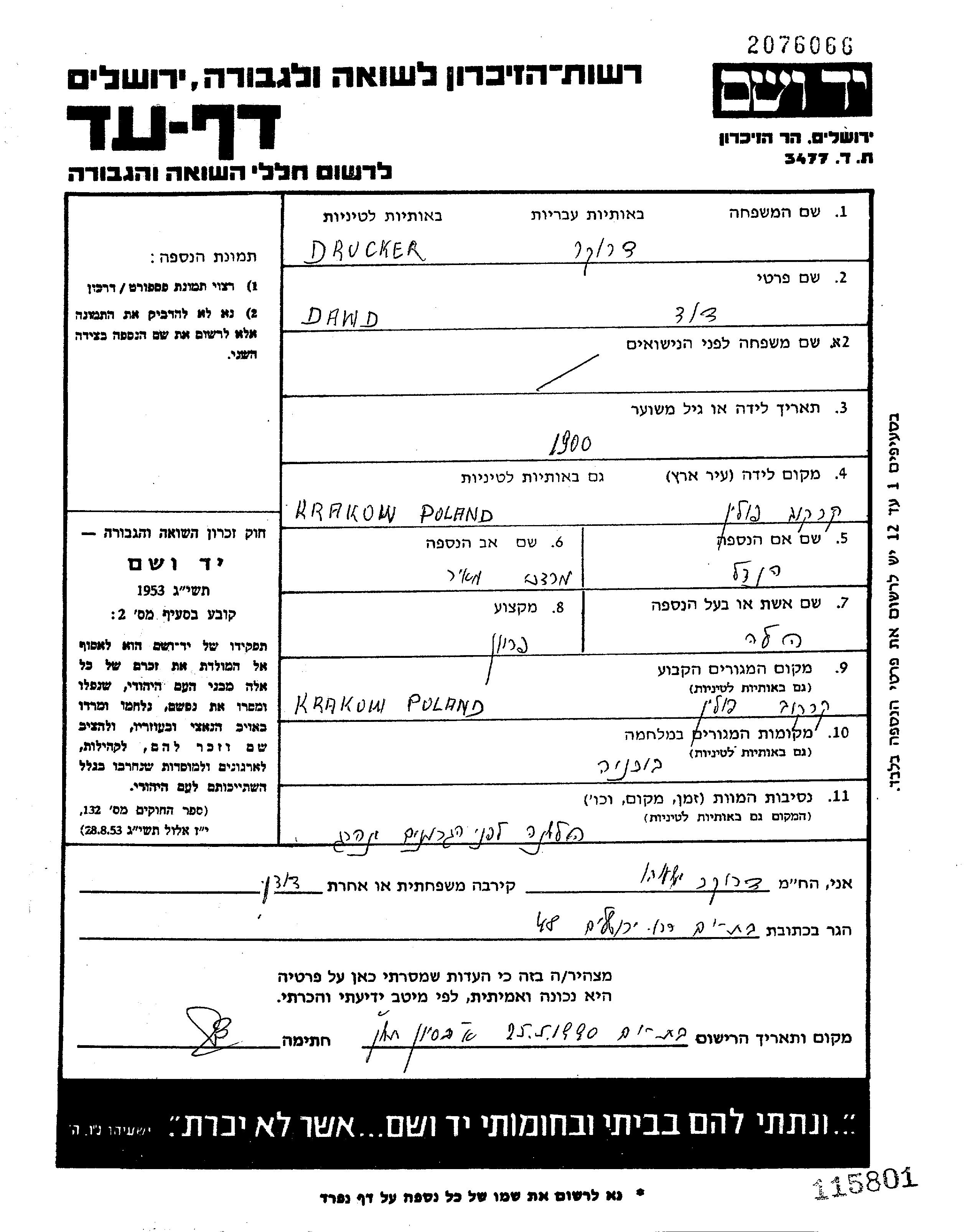 Dawid Drucker נולד בKrakow שבפולין למרדכי מאיר והנדל. הוא היה פרוון ונשוי להלה. לפני מלחמת העולם השניה התגורר בKrakow שבפולין. בזמן המלחמה הוא היה בBochnia שבפולין. הוא נרצח בשואה.