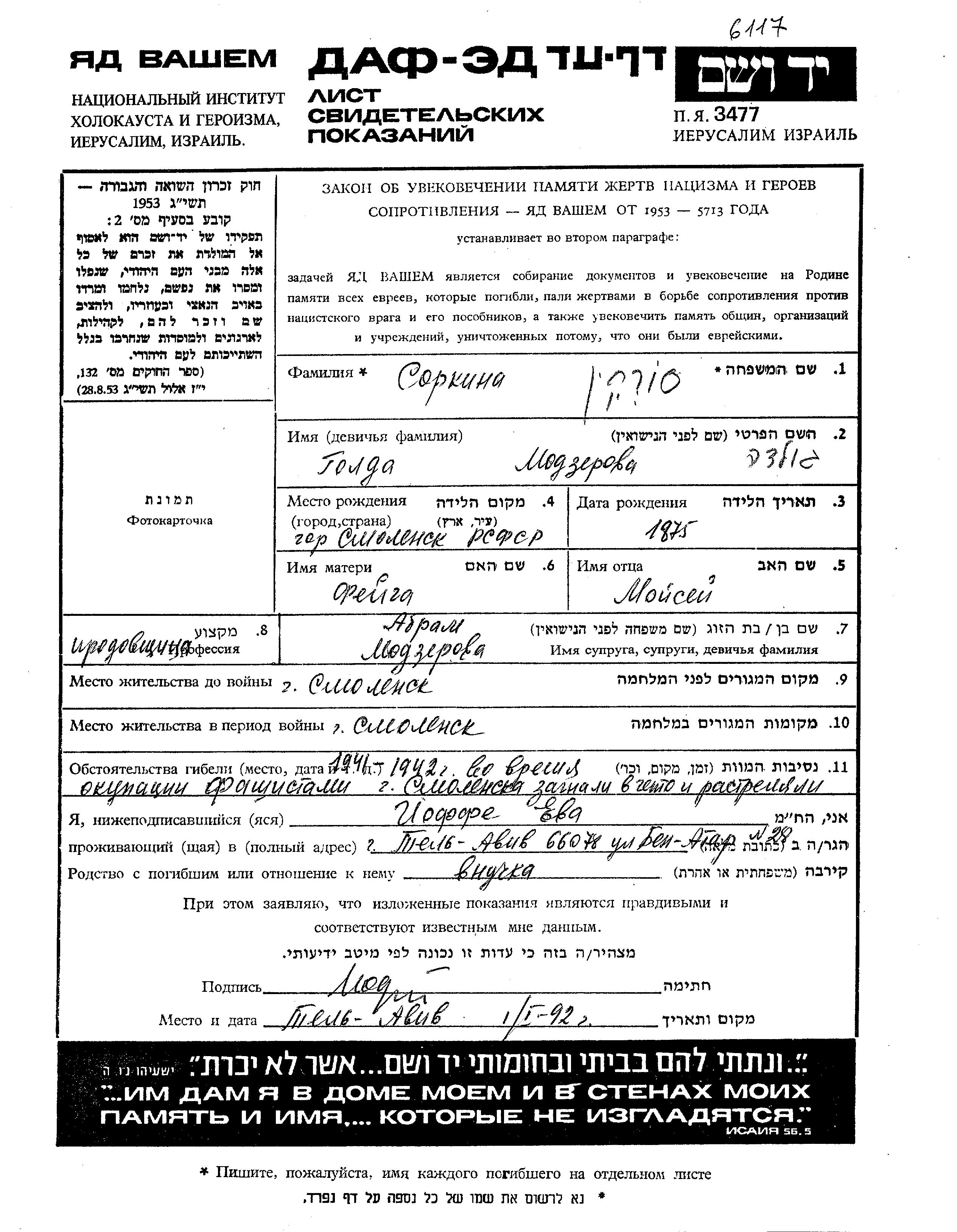 גולדה סורקין לבית Modzerova נולדה בSmolensk שברוסיה (ברה"מ) בשנת 1875 למואיסאי ופייגה. היא היתה זבנית ונשואה לאברם. לפני מלחמת העולם השניה התגוררה בSmolensk שברוסיה (ברה"מ). בזמן המלחמה היא היתה בSmolensk שברוסיה (ברה"מ).
