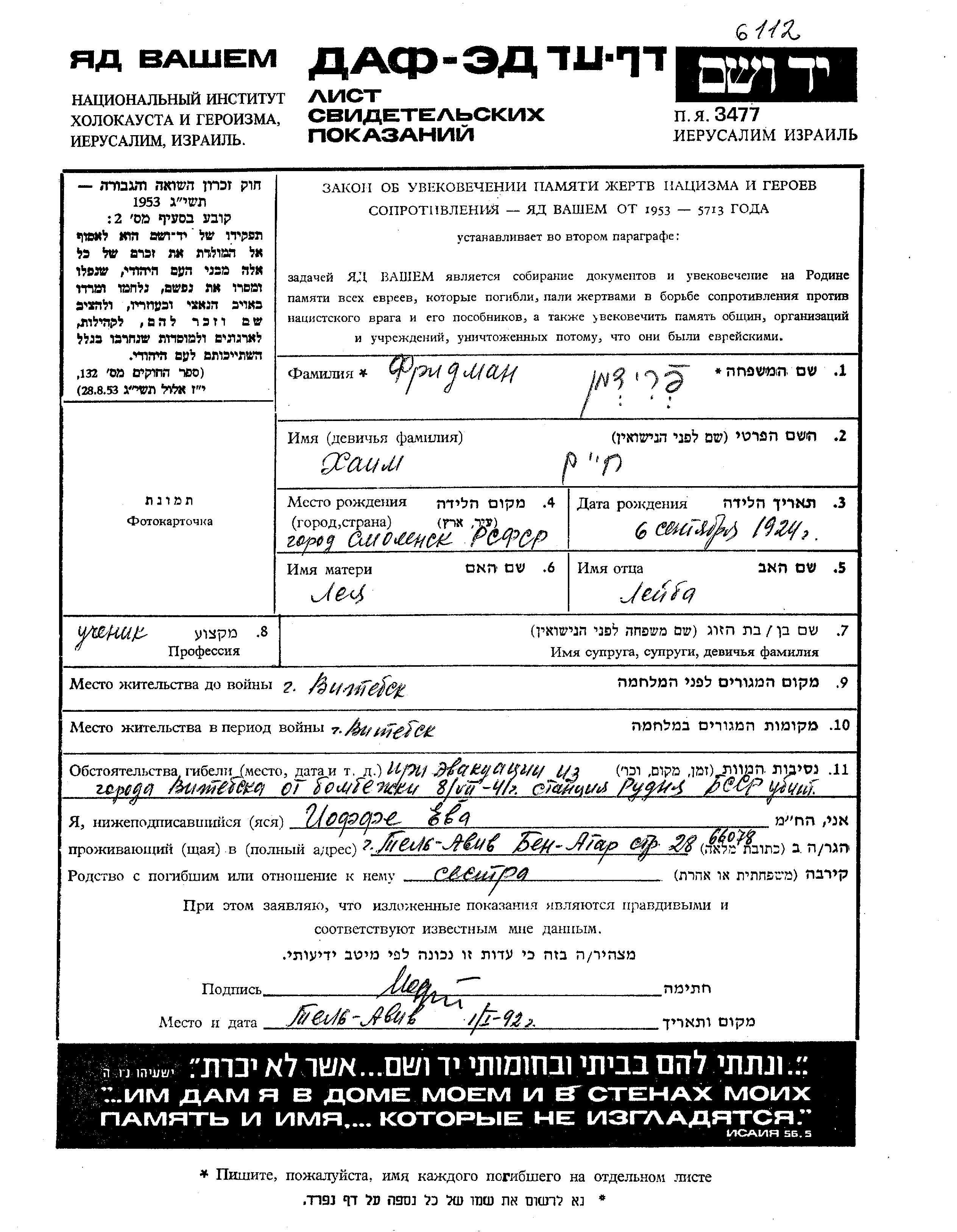 פרידמן חיים 1924 Vitebsk, ביאלורוסיה (ברה"מ) דף-עד
