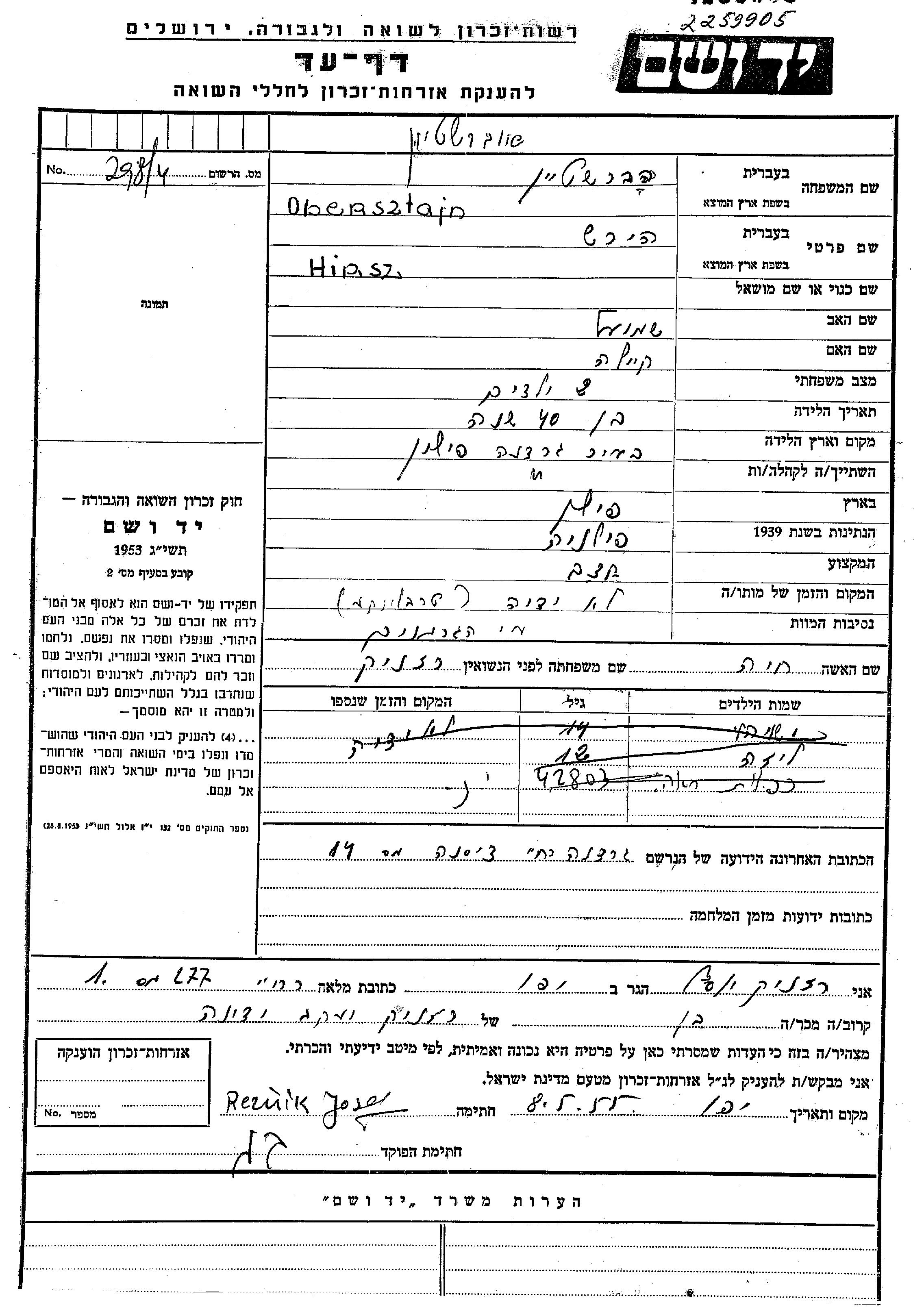 Hirsz Obersztain נולד בGrodno שבפולין לשמואל וקיילה. הוא היה קצב ונשוי לChaja. לפני מלחמת העולם השניה התגורר בGrodno שבפולין. הוא נרצח בשואה. מקום המוות: Treblinka שבפולין.
