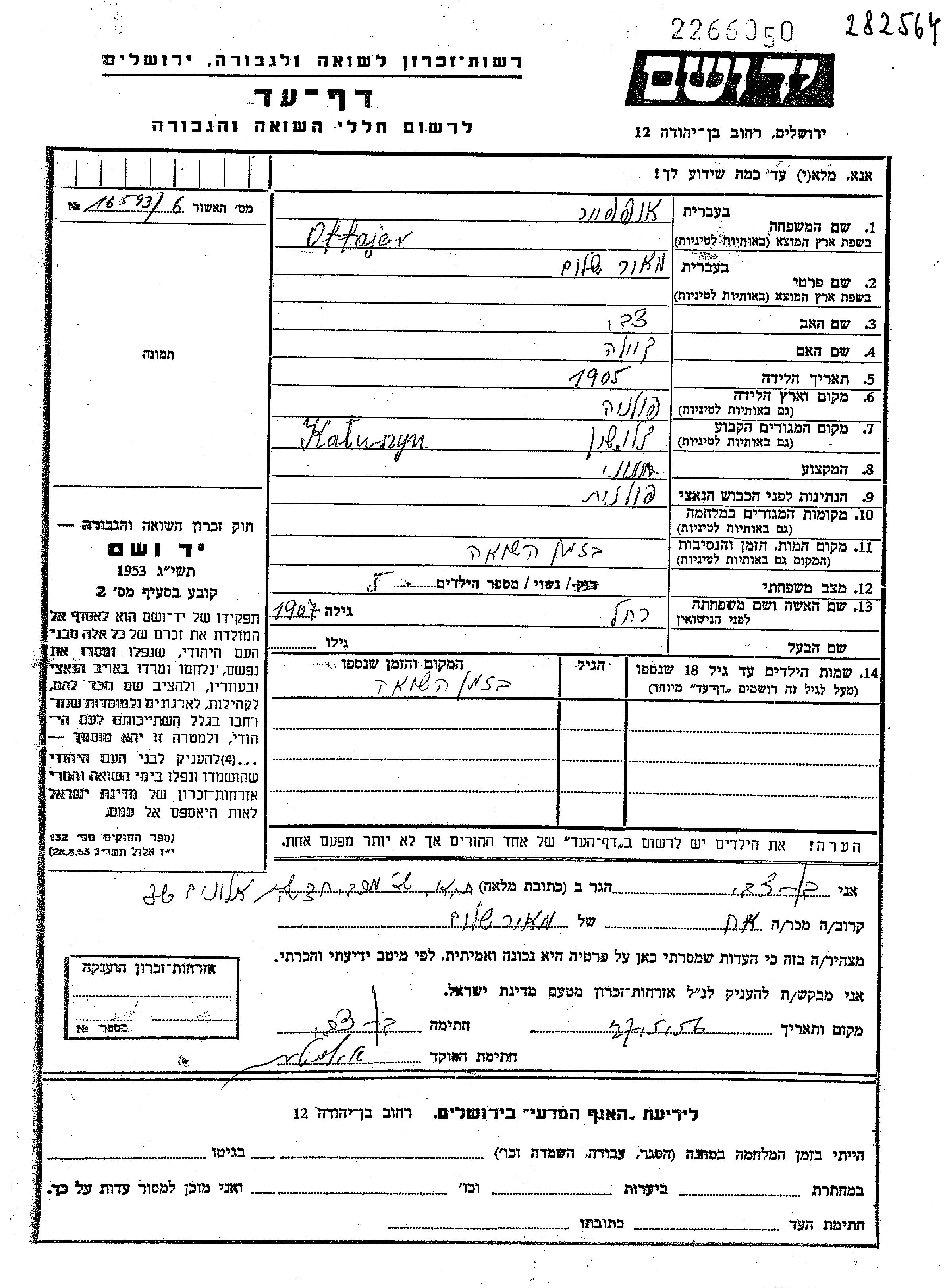 מאיר שלום Offajer נולד בפולין בשנת 1905 לצבי וKajla. הוא היה בעל חנות ונשוי לרחל. לפני מלחמת העולם השניה התגורר בKaluszyn שבפולין. מאיר שלום נרצח בשואה.