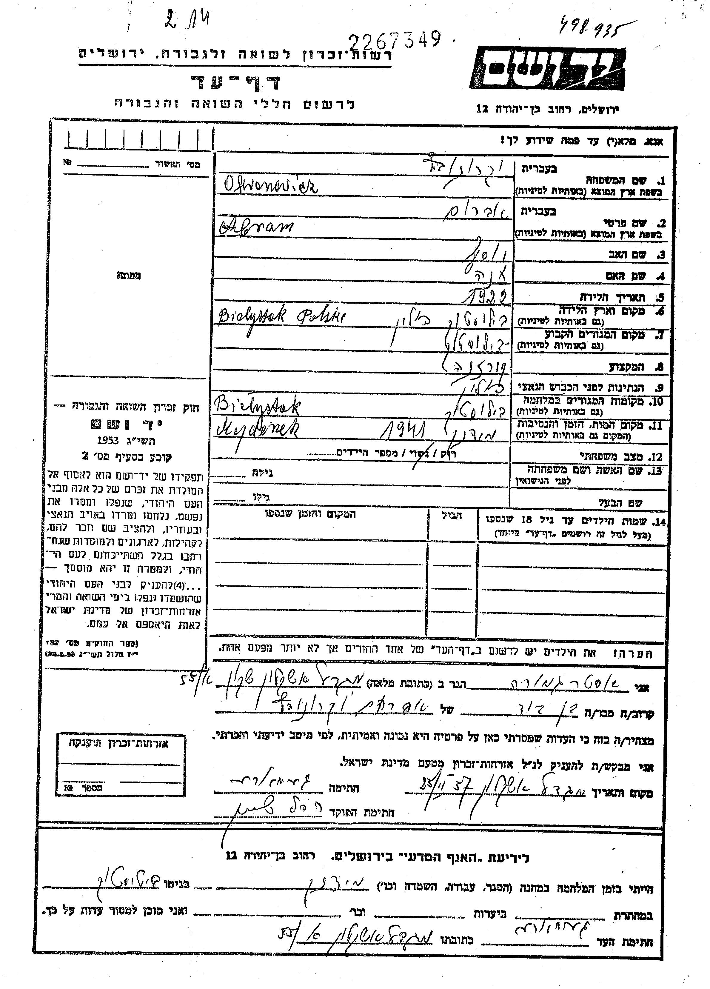 Okronowicz אברם 1922 Bialystok, פולין דף-עד