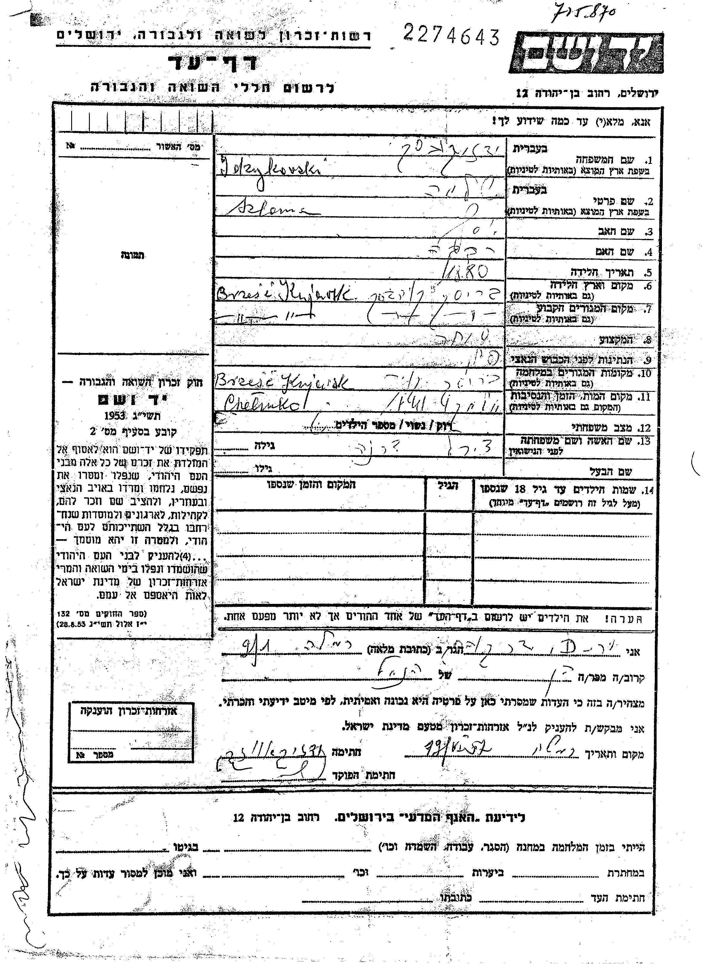יד ושם - המפעל להנצחת השמות בדפי עד
