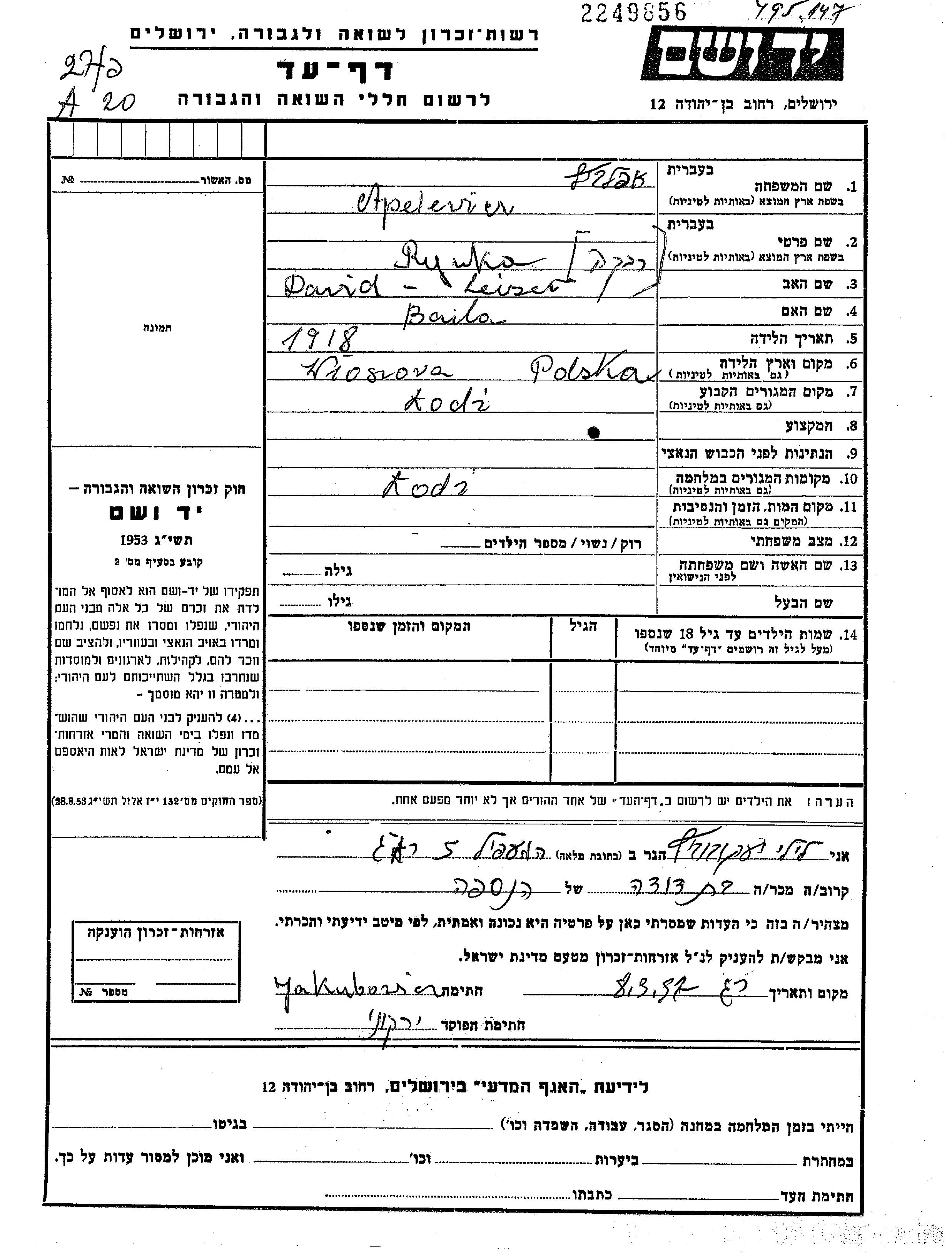 Rywka Apelowicz נולדה בWyzlow שבפולין בשנת 1918 לדוד אליעזר וBaila. היא היתה רווקה. לפני מלחמת העולם השניה התגוררה בLodz שבפולין. בזמן המלחמה היא היתה בLodz שבפולין. היא נרצחה בשואה. מקום המוות: 'S Graveland שבהולנד.