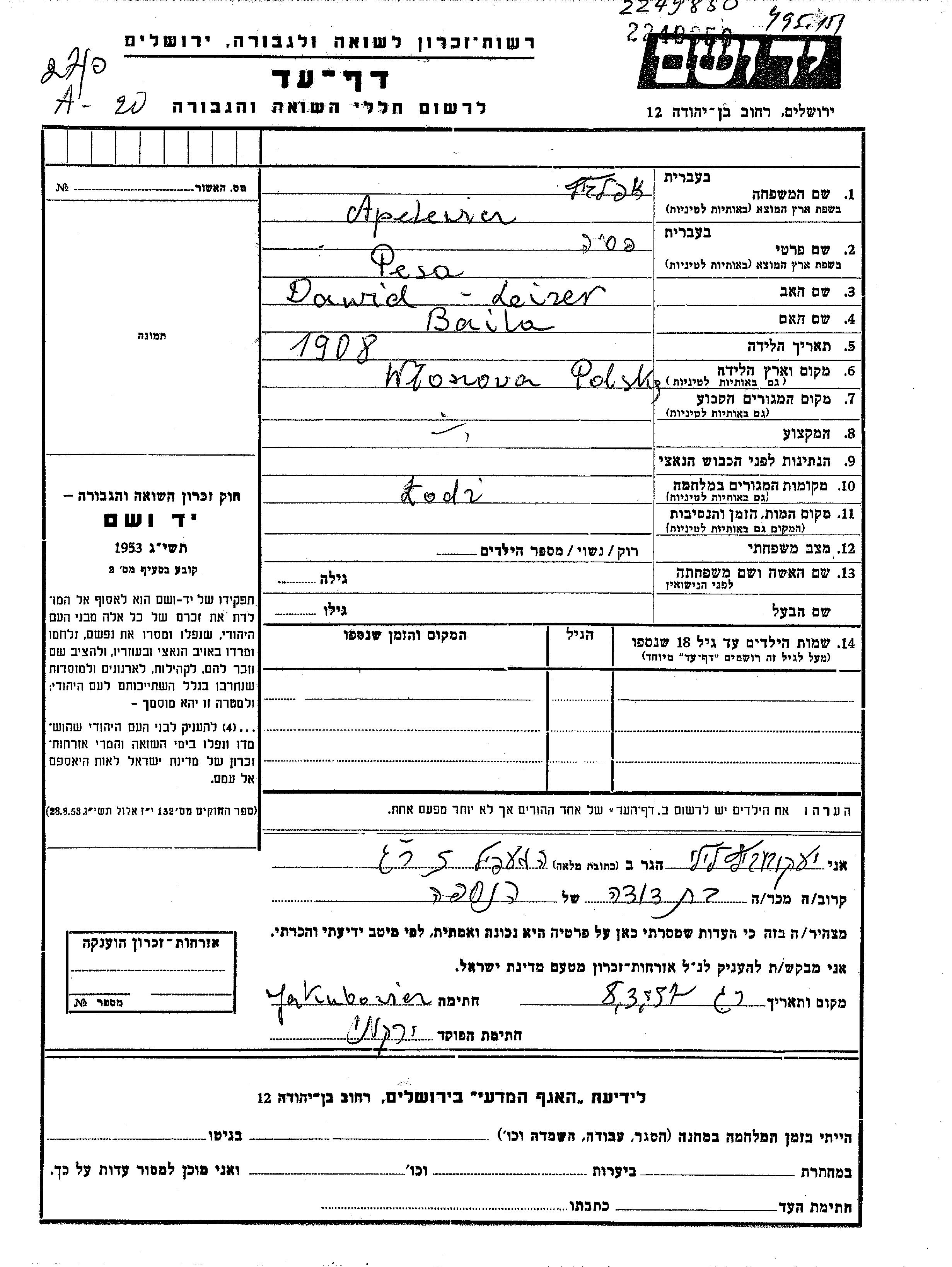 פסה פסיה Apelewicz נולדה בWloszczowa שבפולין בשנת 1908 לדוד עליאזר וBaila. היא היתה רווקה. לפני מלחמת העולם השניה התגוררה בWloszczowa שבפולין. בזמן המלחמה היא היתה בLodz שבפולין.