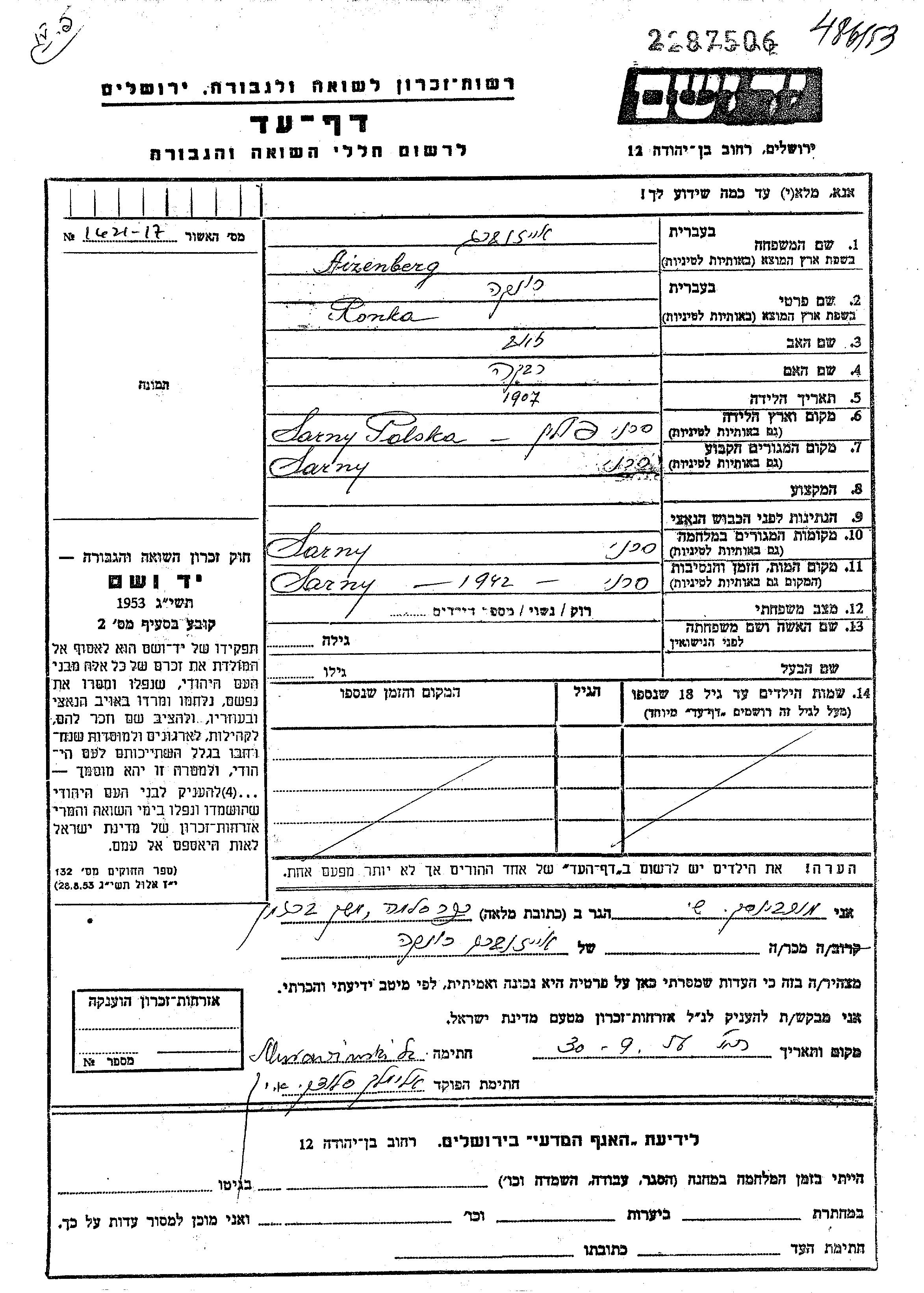 רוניה Aizenberg נולדה בSarny שבפולין בשנת 1907 לWolf זאב וRywka. לפני מלחמת העולם השניה התגוררה בSarny שבפולין. בזמן המלחמה היא היתה בSarny שבפולין. רוניה נרצחה בשואה. מקום המוות: Sarny שבפולין בשנת 1942.