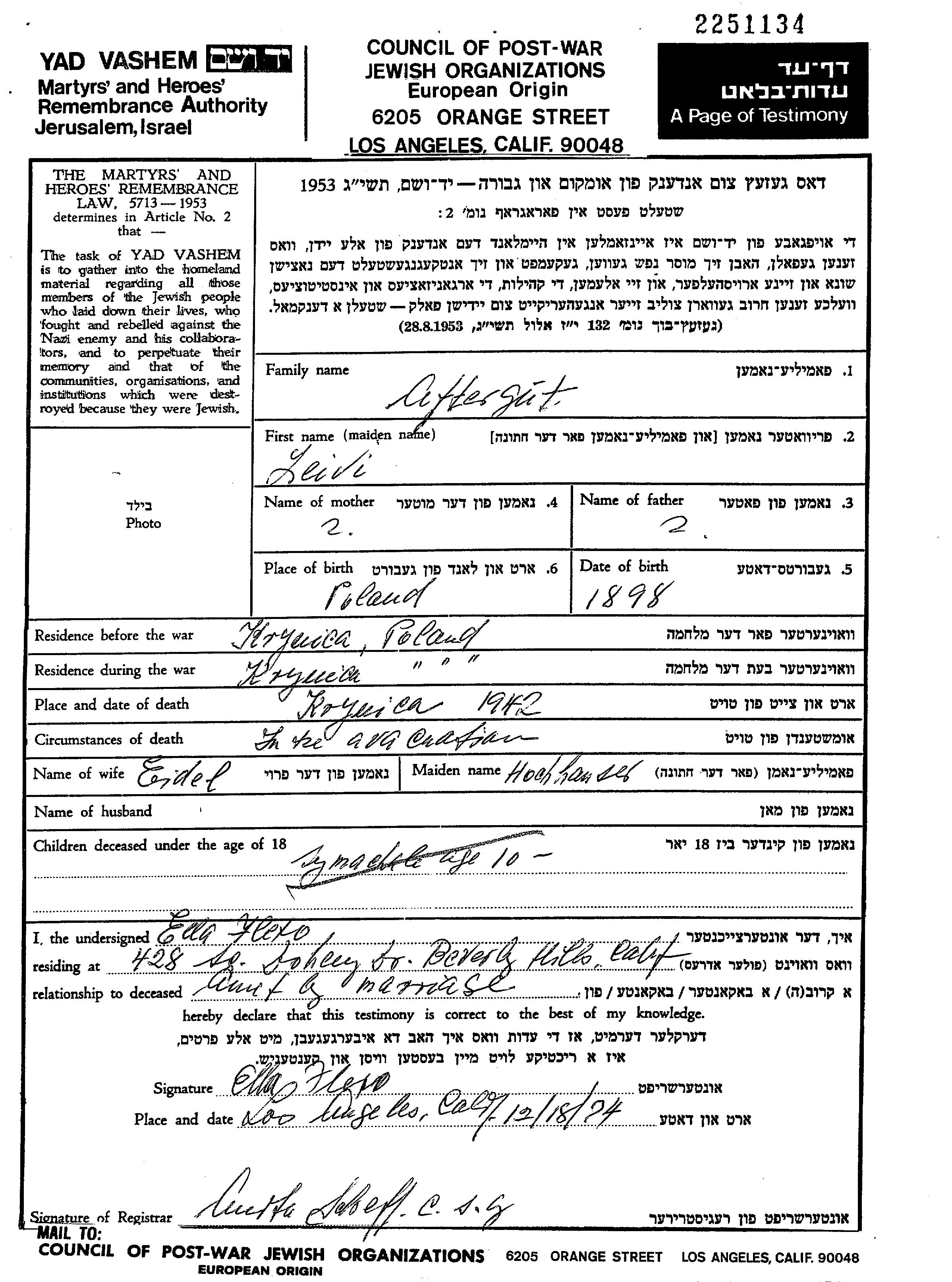 הוא נרצח בשואה. מקום המוות: Krynica שבפולין בשנת 1942.