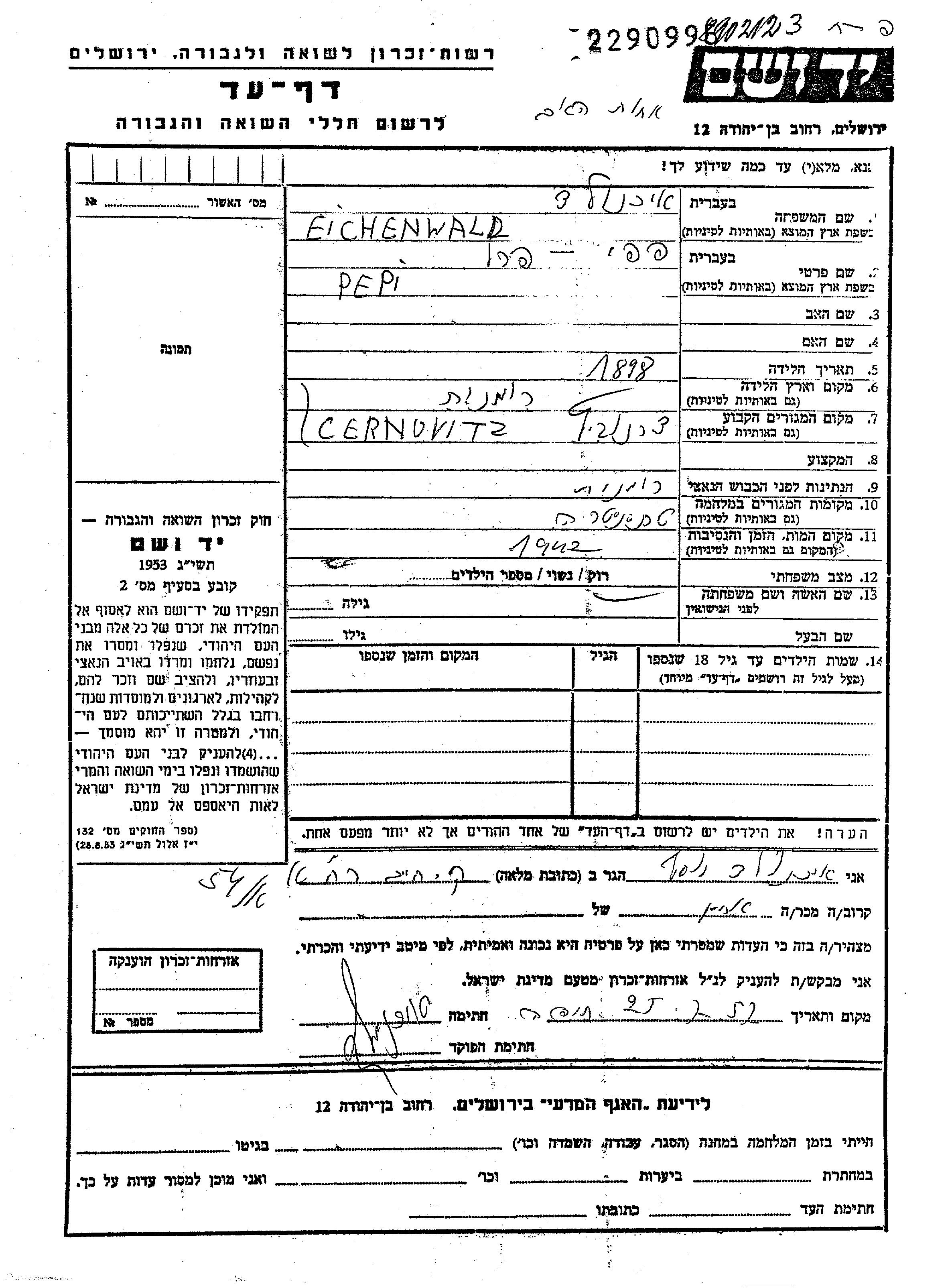 Pepi פפי Eichenwald נולד בCernauti שברומניה בשנת 1898. הוא היה רווק. לפני מלחמת העולם השניה התגורר בCernauti שברומניה. בזמן המלחמה הוא היה בTransnistria שבאוקראינה (ברה"מ). הוא נרצח בשואה. מקום המוות: לא ידוע בשנת 1942.