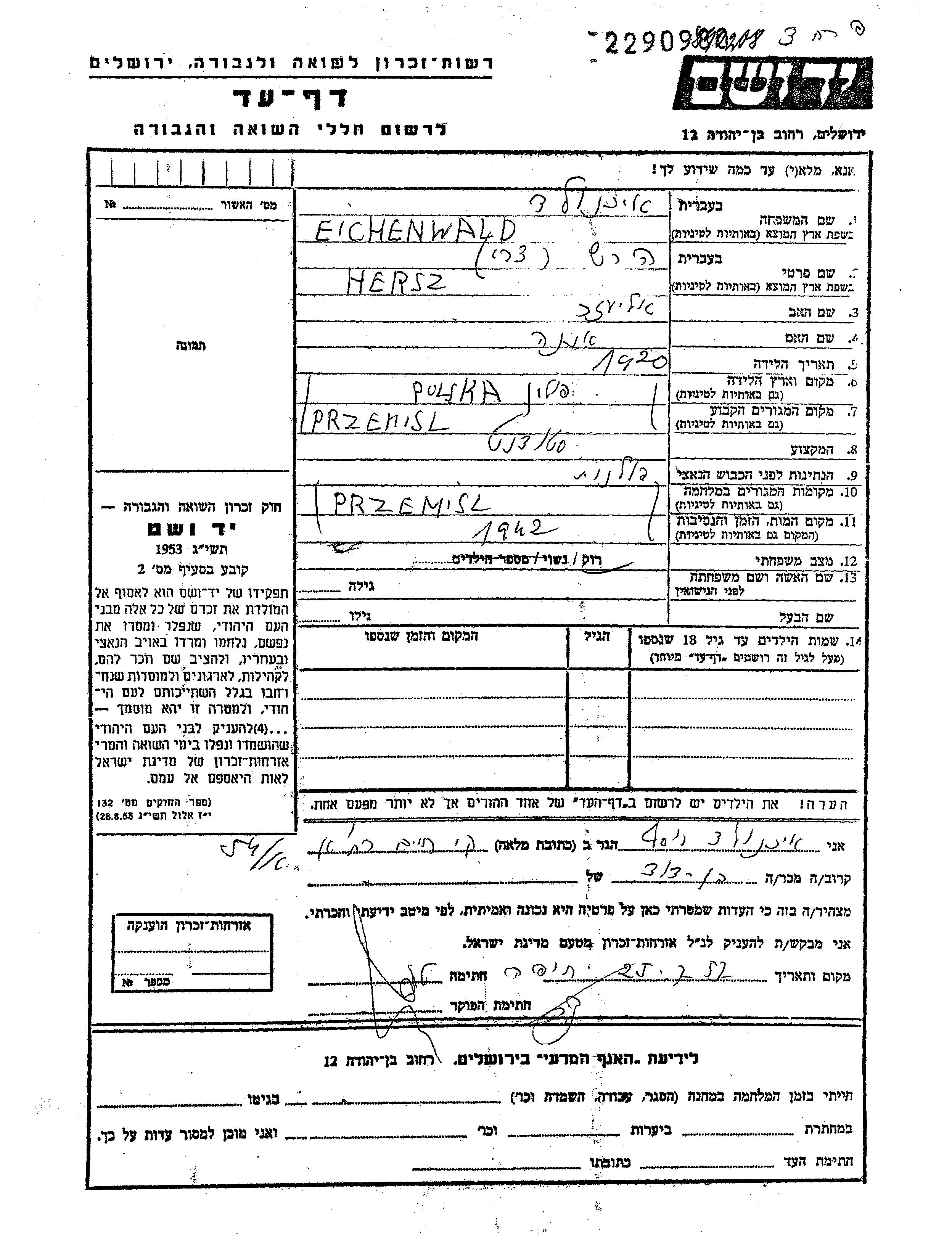 Hersz Eichenwald נולד בPrzemysl שבפולין בשנת 1920 לאליעזר ואנה. הוא היה סטודנט ורווק. לפני מלחמת העולם השניה התגורר בPrzemysl שבפולין. בזמן המלחמה הוא היה בPrzemysl שבפולין.