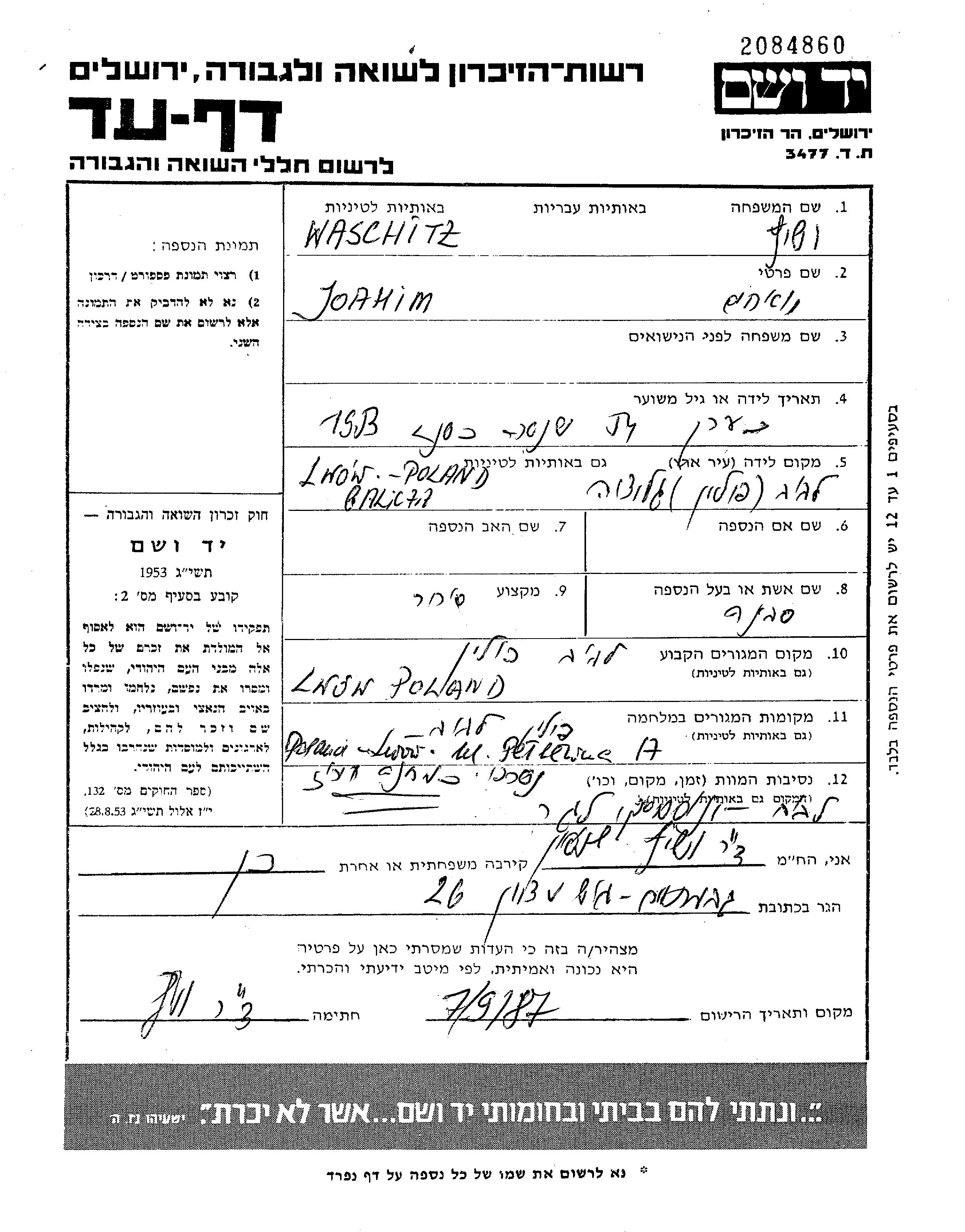 Joahim Waschitz נולד בLwow שבפולין. הוא היה סוחר ונשוי לסבינה. לפני מלחמת העולם השניה התגורר בLwow שבפולין. בזמן המלחמה הוא היה בLwow שבפולין.