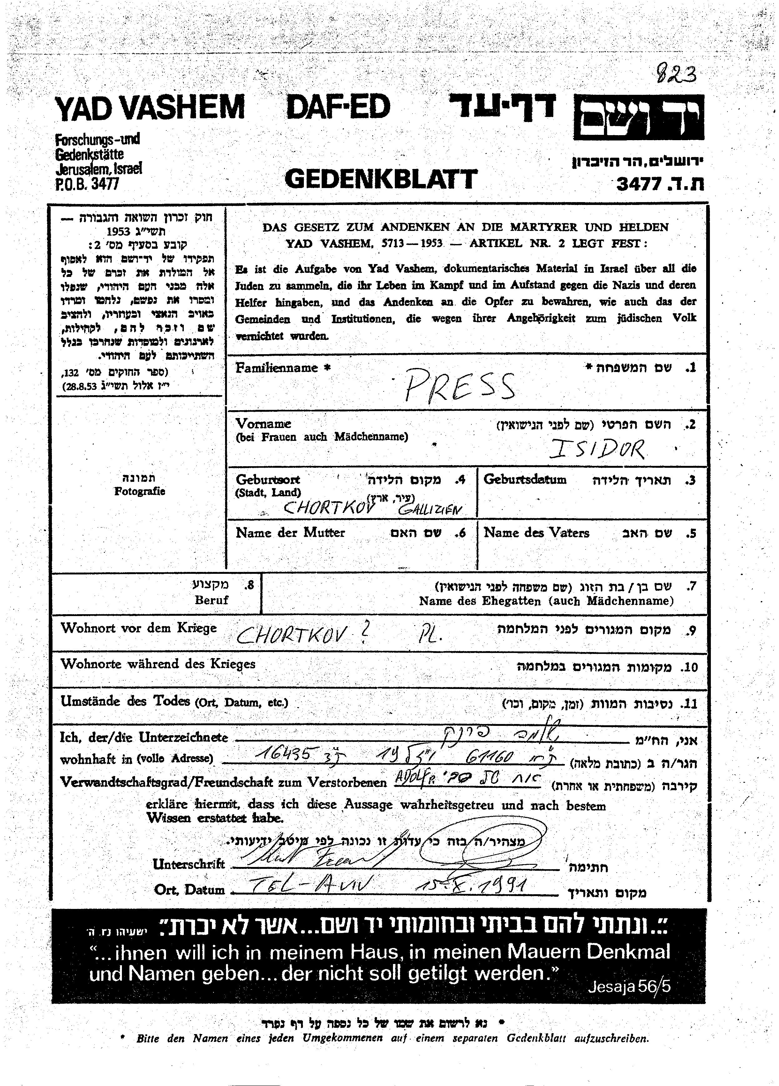 Isidor Press נולד בCzortkow שבפולין. לפני מלחמת העולם השניה התגורר בCzortkow שבפולין.