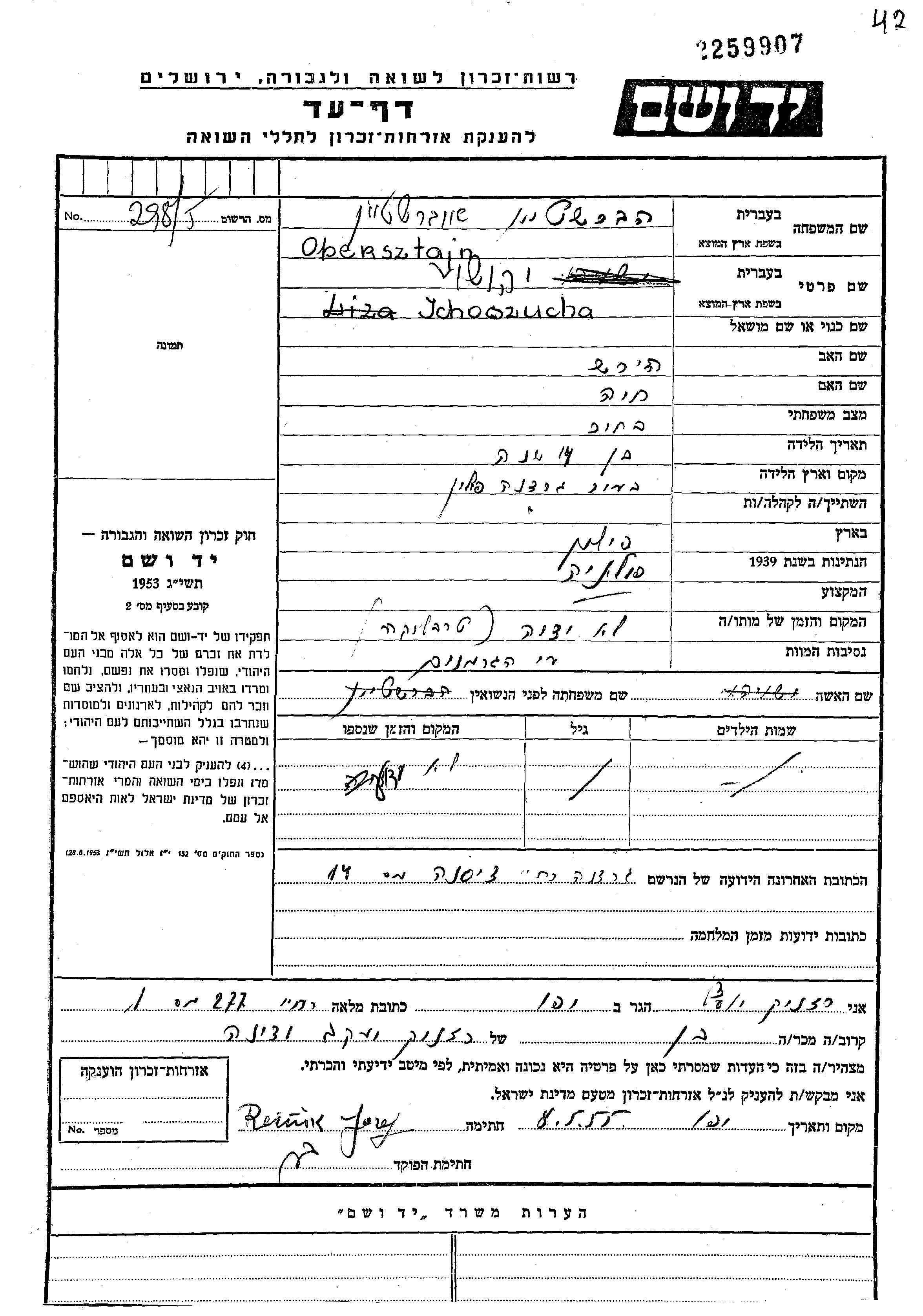 Ichoszucha Obersztajn הברשטיין נולד בGrodno שבפולין לHirsz וChaja לבית רזניק. הוא היה ילד. לפני מלחמת העולם השניה התגורר בGrodno שבפולין. הוא נרצח בשואה. מקום המוות: Treblinka שבפולין.
