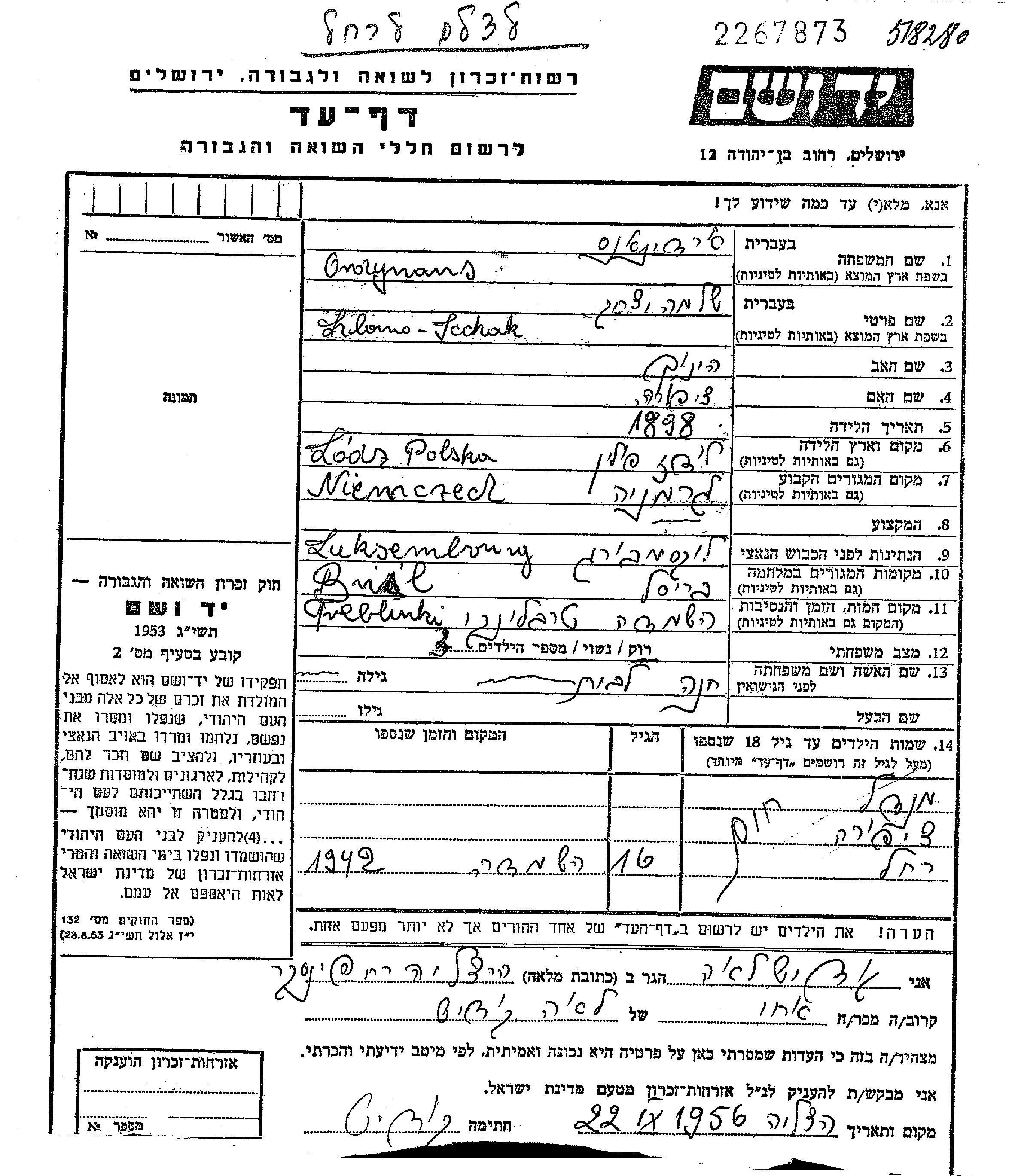 Szlomo Icchak Ordynans נולד בLodz שבפולין בשנת 1898 לHejnoch Israel וצפורה לבית בלווט. הוא היה נשוי לחנה. לפני מלחמת העולם השניה התגורר בגרמניה. בזמן המלחמה הוא היה בBruxelles שבבלגיה. הוא נרצח בשואה. מקום המוות: Treblinka שבפולין.