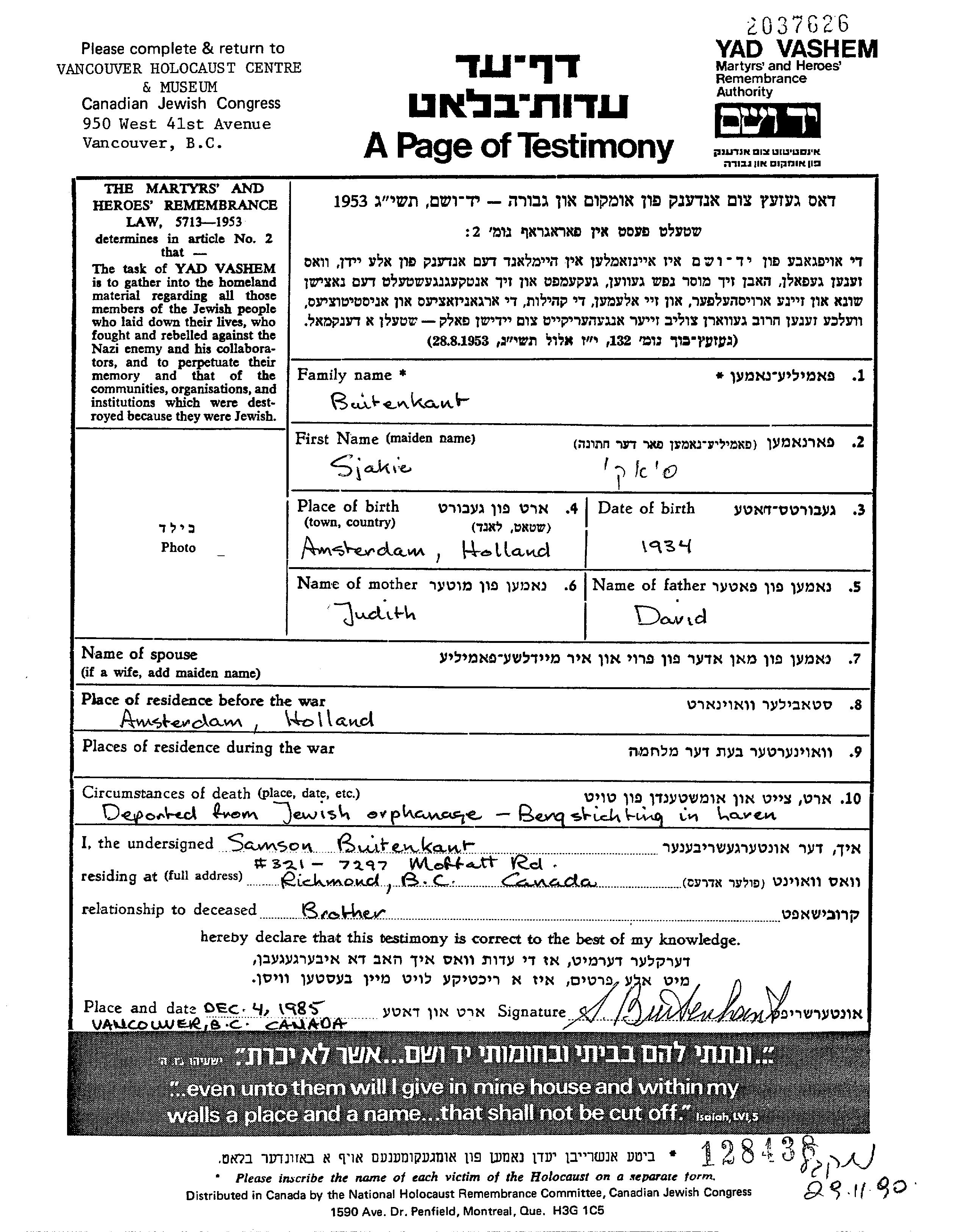 Sjakie Buitenkant נולדה בAmsterdam שבהולנד בשנת 1934 לדוד וJudith לבית Bever van. היא היתה ילדה. לפני מלחמת העולם השניה התגוררה בAmsterdam שבהולנד. בזמן המלחמה היא היתה בLaren שבהולנד. היא נרצחה בשואה.