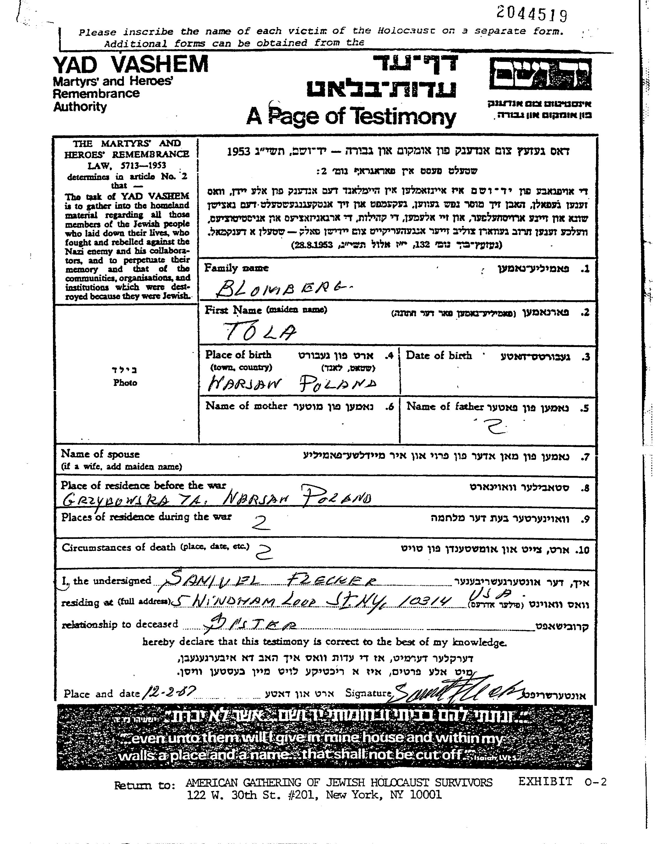 טולה בלומברג נולדה בWarszawa שבפולין. לפני מלחמת העולם השניה התגוררה בWarszawa שבפולין.