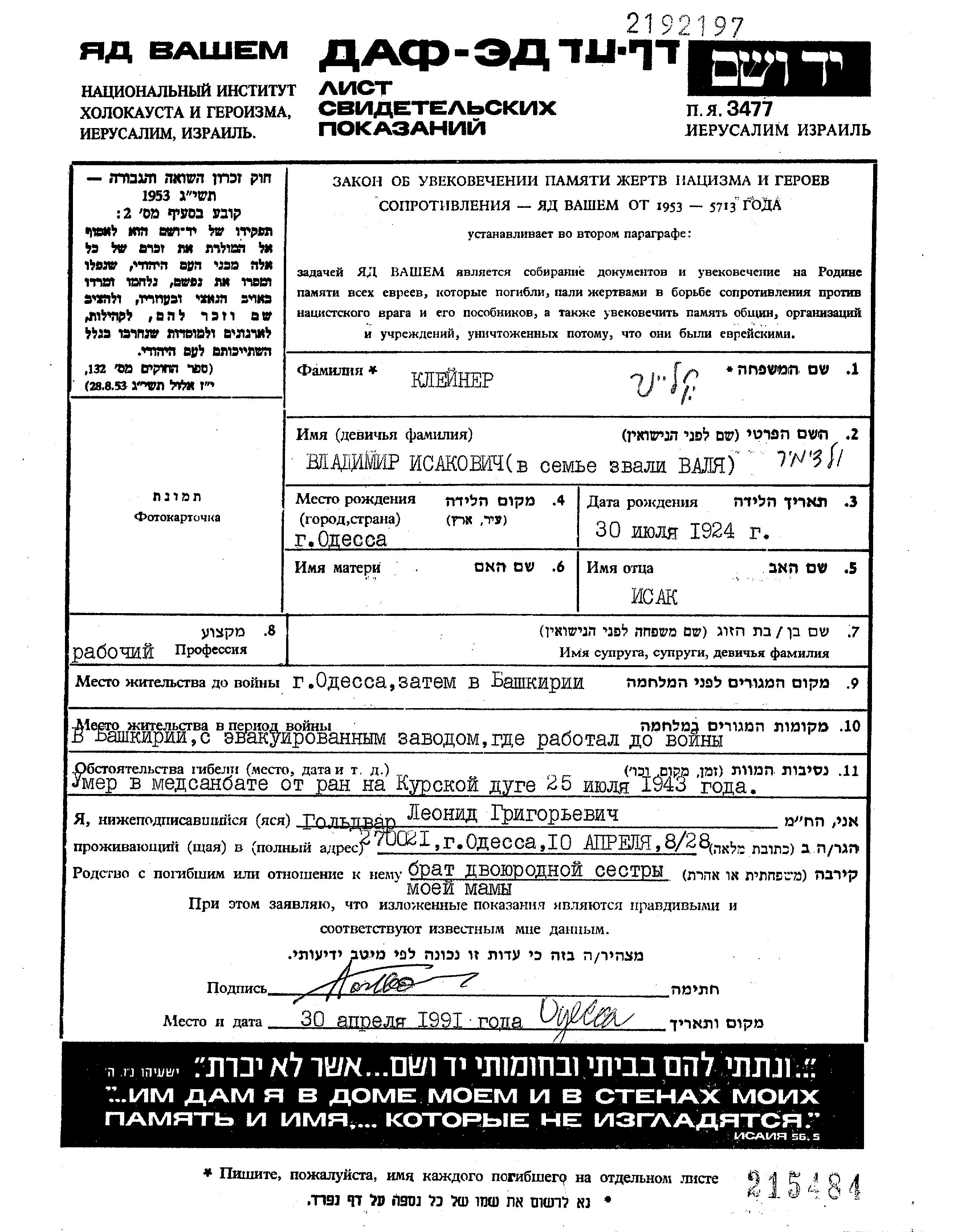 Valya ולדימיר וליה קליינר נולד בOdessa שבאוקראינה (ברה"מ) בשנת 1924 לאיסק. הוא היה פועל. לפני מלחמת העולם השניה התגורר בOdessa שבאוקראינה (ברה"מ). בזמן המלחמה הוא היה ברוסיה (ברה"מ).