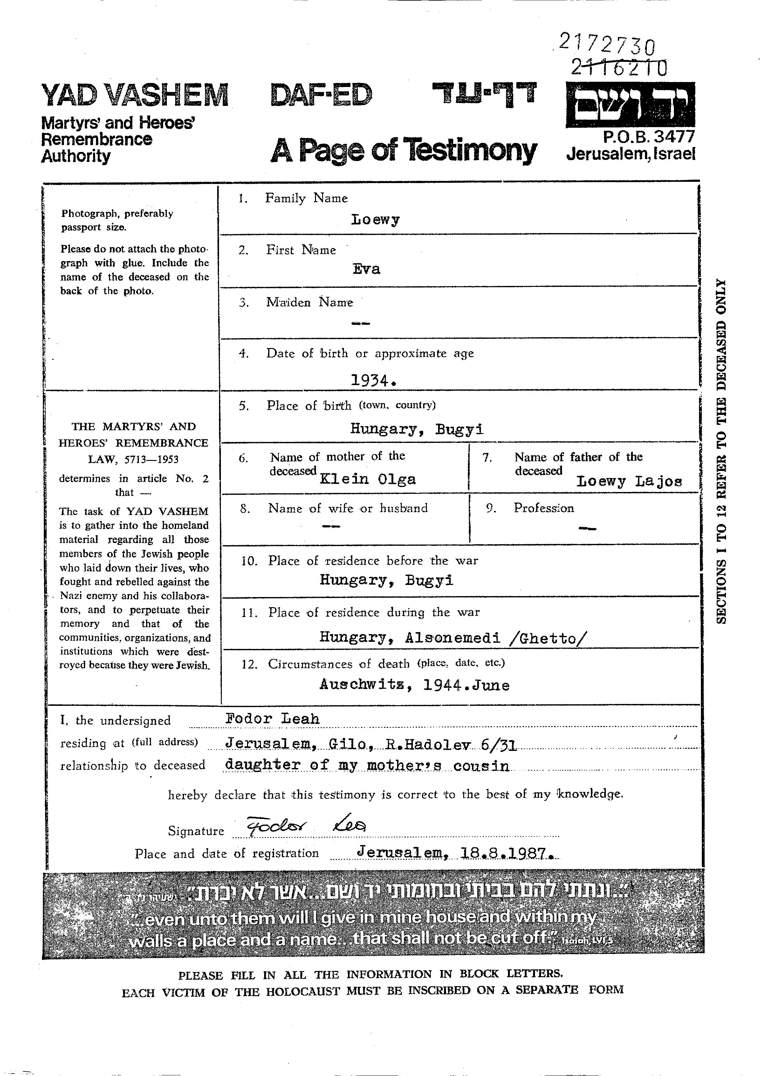 אווה Loewy נולדה בBugyi שבהונגריה בשנת 1934 לLajos ואולגה לבית קליין. היא היתה ילדה. לפני מלחמת העולם השניה התגוררה בBugyi שבהונגריה. בזמן המלחמה היא היתה בAlsonemedi שבהונגריה. אווה נרצחה בשואה. מקום המוות: Auschwitz שבפולין בשנת 1944.