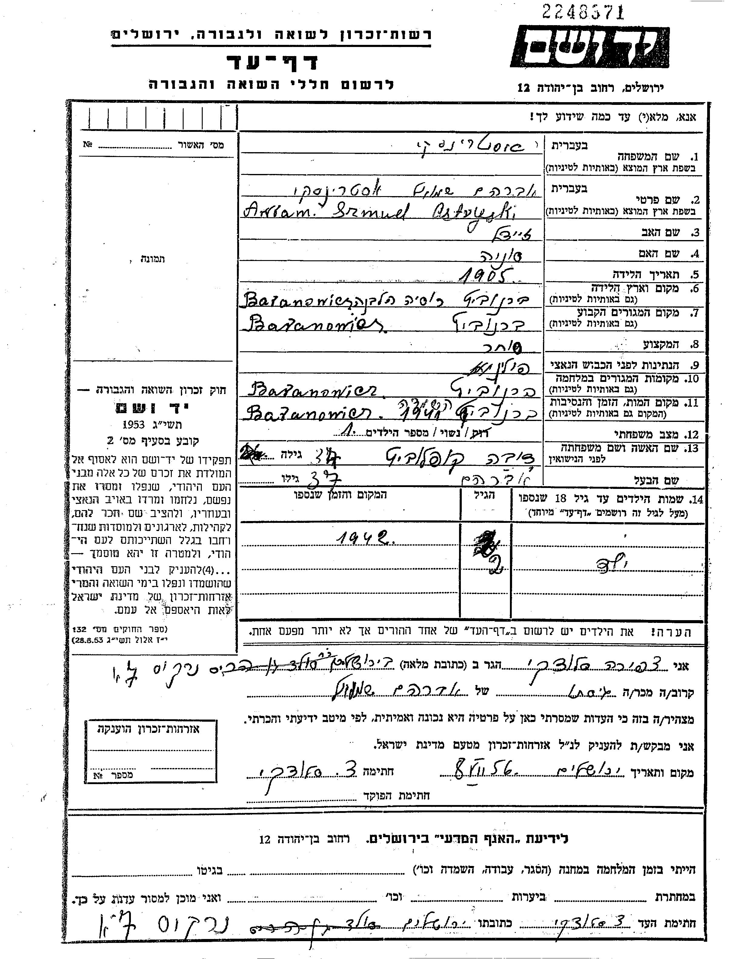 Astrynski Awram Szmuel 1905 Baranowicze, פולין דף-עד