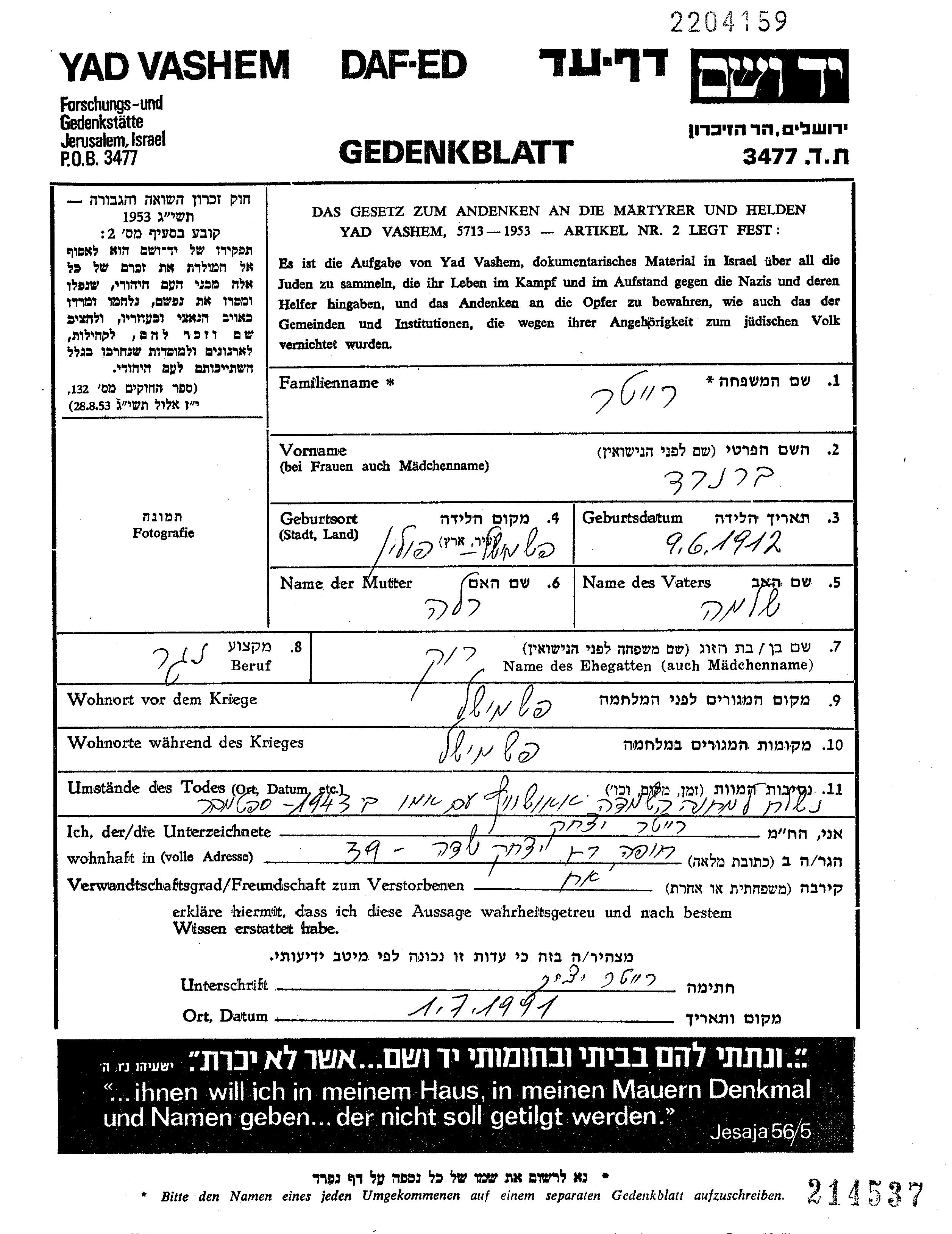 יד ושם - המפעל להנצחת השמות בדפי עד