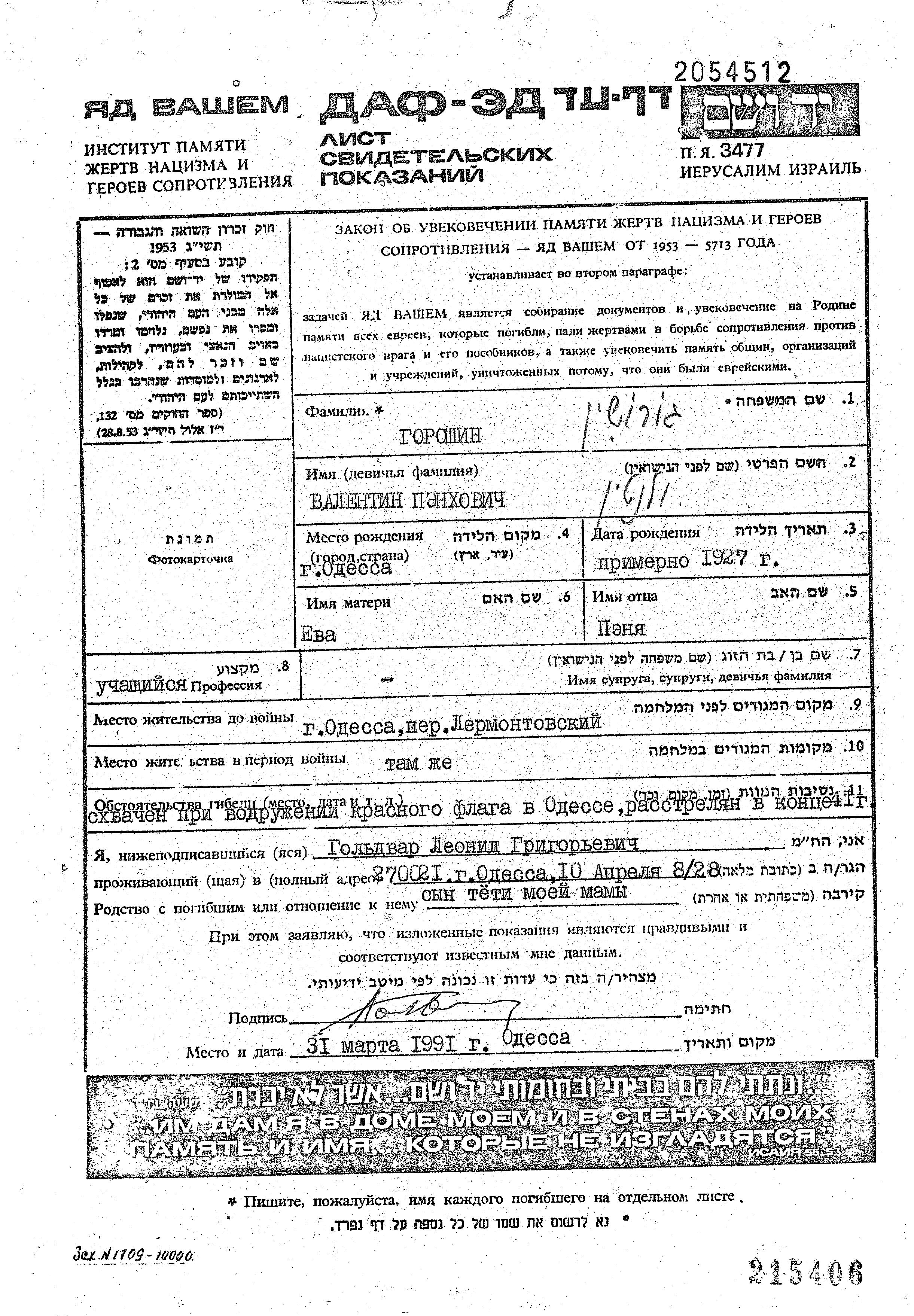 ולנטין גורושין נולד בOdessa שבאוקראינה (ברה"מ) לפניה פניה וYeva לבית קליינר. הוא היה תלמיד וילד. לפני מלחמת העולם השניה התגורר בOdessa שבאוקראינה (ברה"מ). בזמן המלחמה הוא היה בOdessa שבאוקראינה (ברה"מ). ולנטין נרצח בשואה. מקום המוות: Odessa שבאוקראינה (ברה"מ).