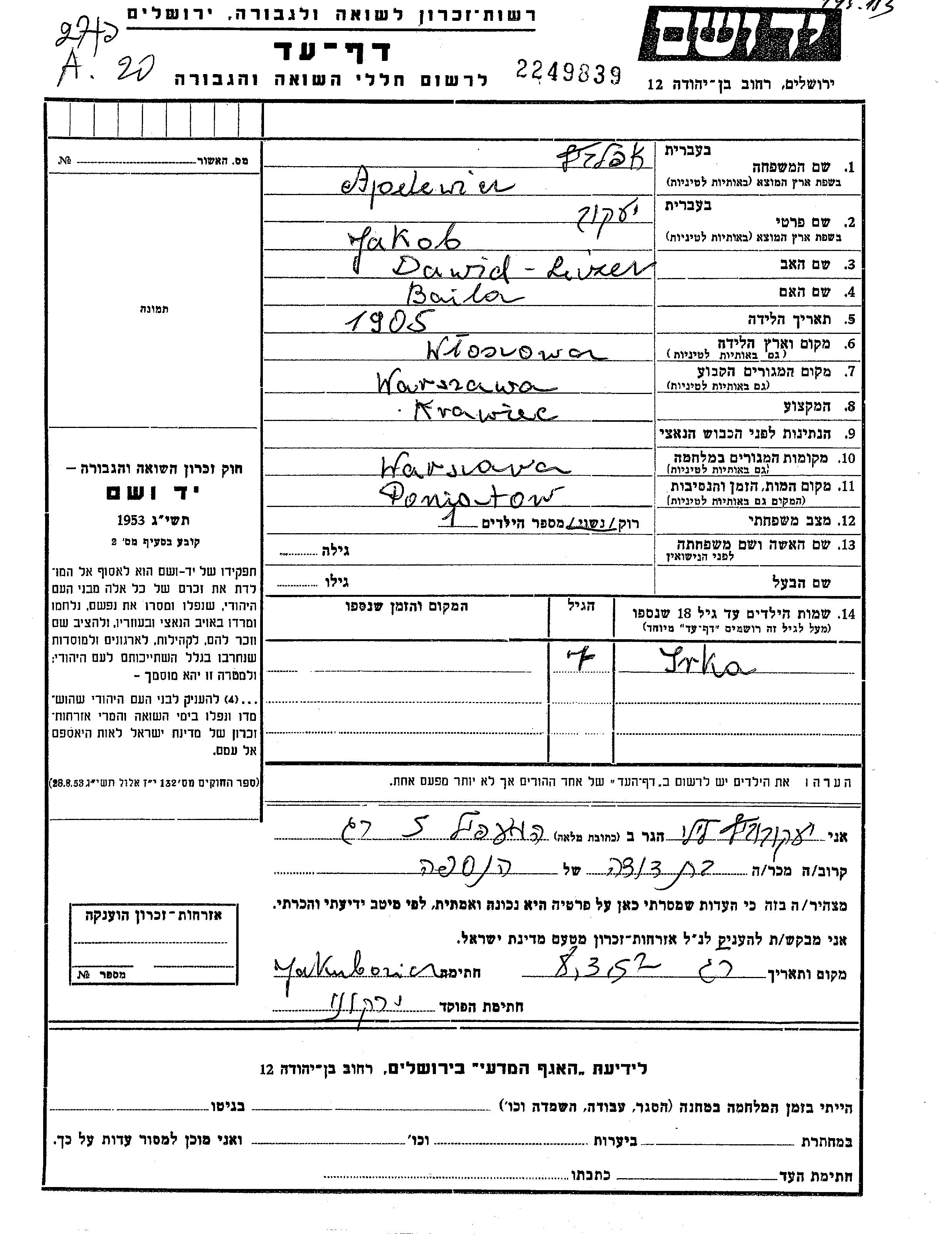 Apelewicz Jakob 1905 Warszawa, פולין דף-עד