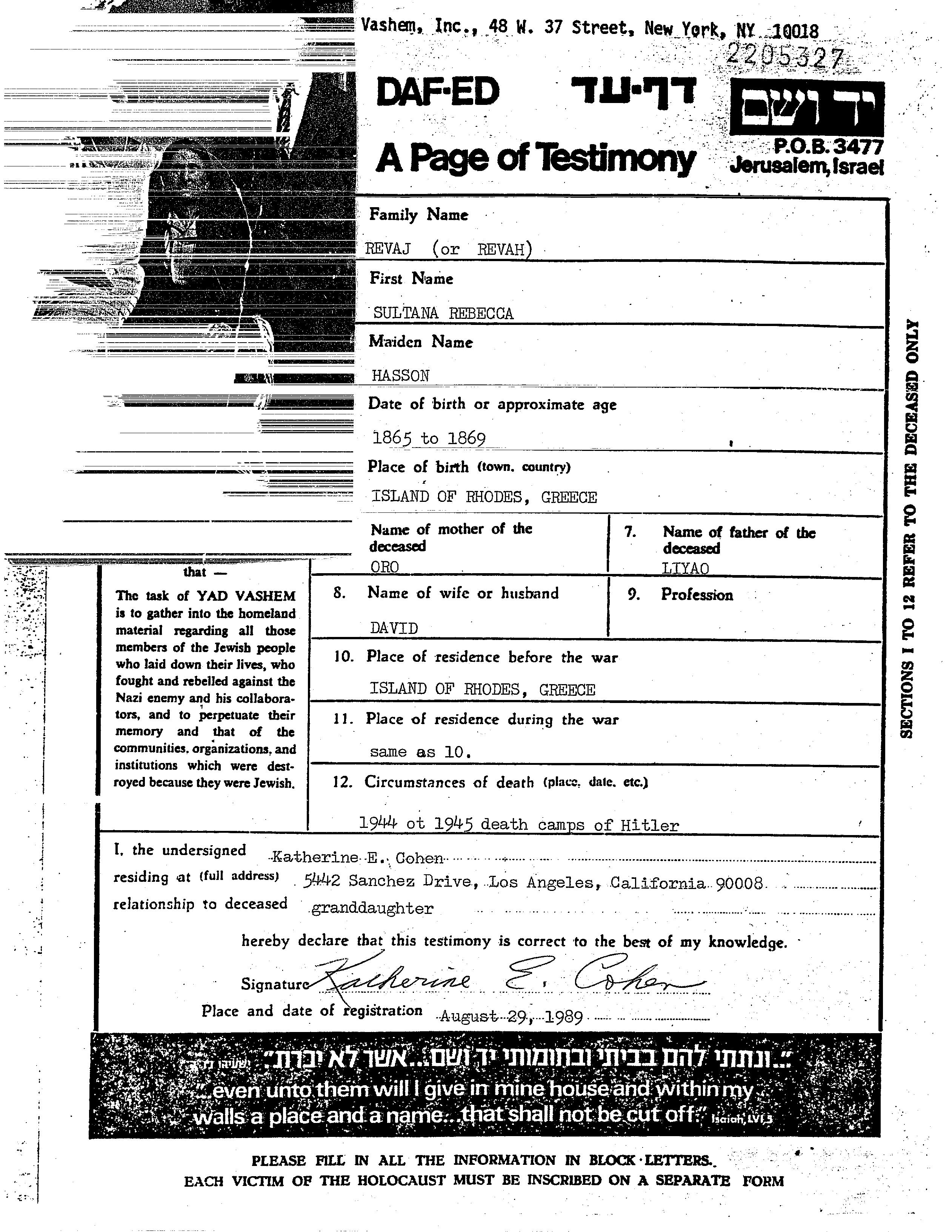 Rebecca סולטנה Revah Revaj לבית Hasson נולדה בRhodes שבאיטליה בשנת 1865 לLiyao ואורו. היא היתה נשואה לדוד. לפני מלחמת העולם השניה התגוררה בRhodes שבאיטליה. בזמן המלחמה היא היתה בRhodes שבאיטליה.