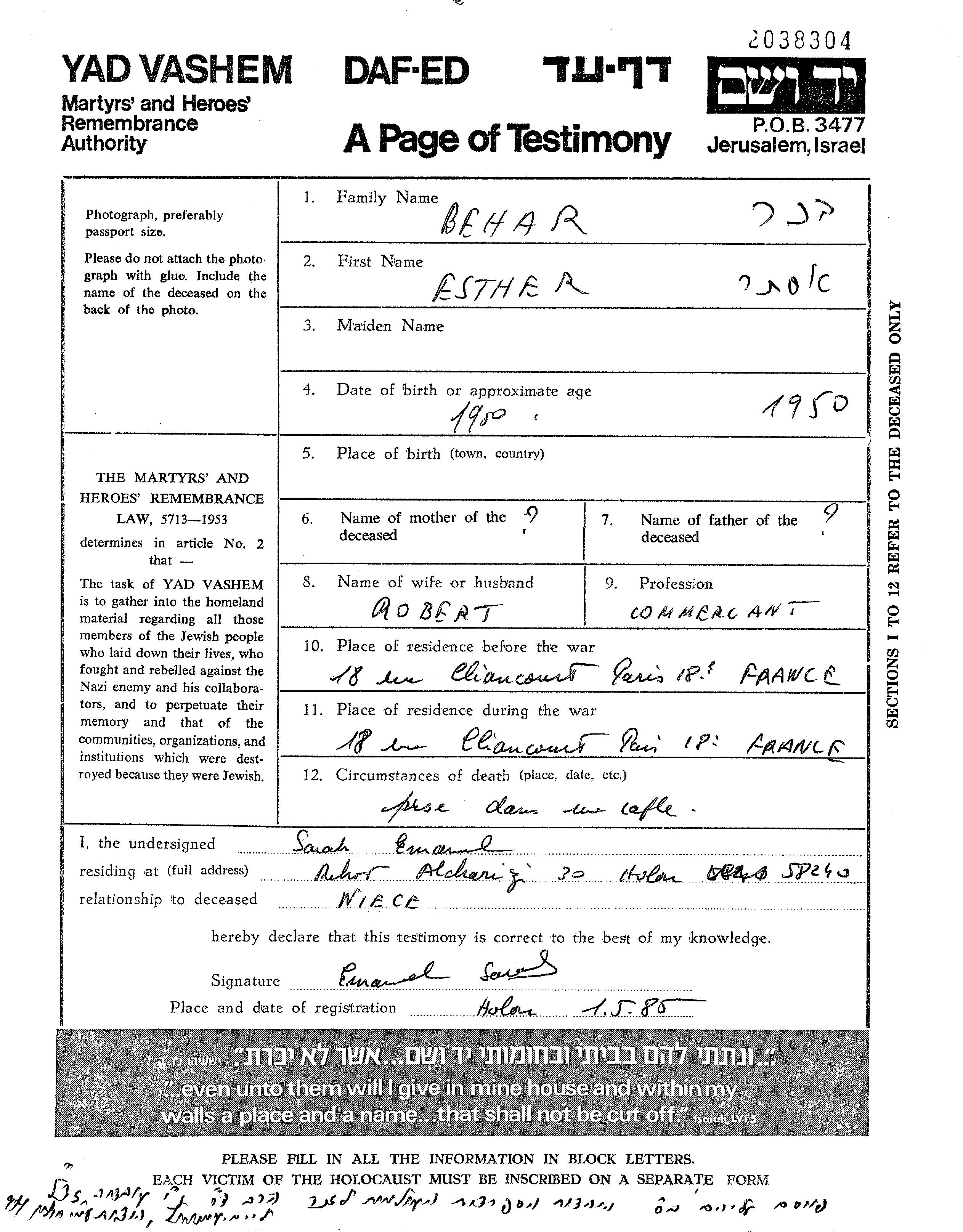 אסתר בהר בכר. היא היתה נשואה לרוברט. לפני מלחמת העולם השניה התגוררה בParis שבצרפת. בזמן המלחמה היא היתה בParis שבצרפת.