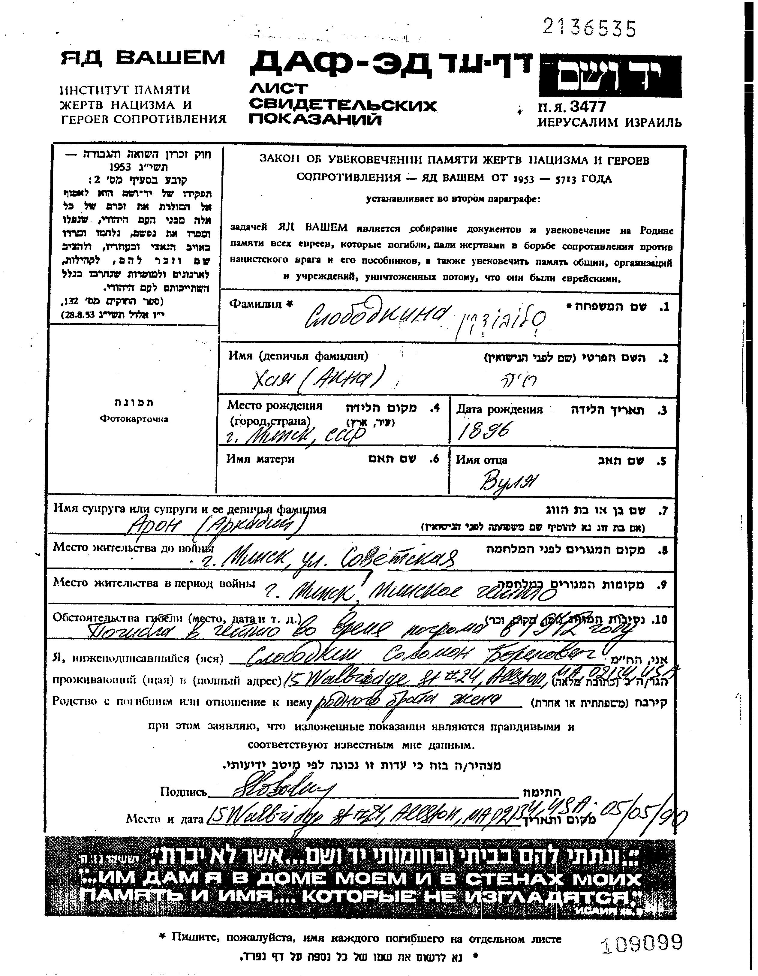 חייה אנה סלובודקין נולדה בMinsk שבביאלורוסיה (ברה"מ) לVulya. היא היתה נשואה לארון ארקדי. לפני מלחמת העולם השניה התגוררה בMinsk שבביאלורוסיה (ברה"מ). בזמן המלחמה היא היתה בMinsk שבביאלורוסיה (ברה"מ). חייה אנה נרצחה בשואה. מקום המוות: Minsk שבביאלורוסיה (ברה"מ).