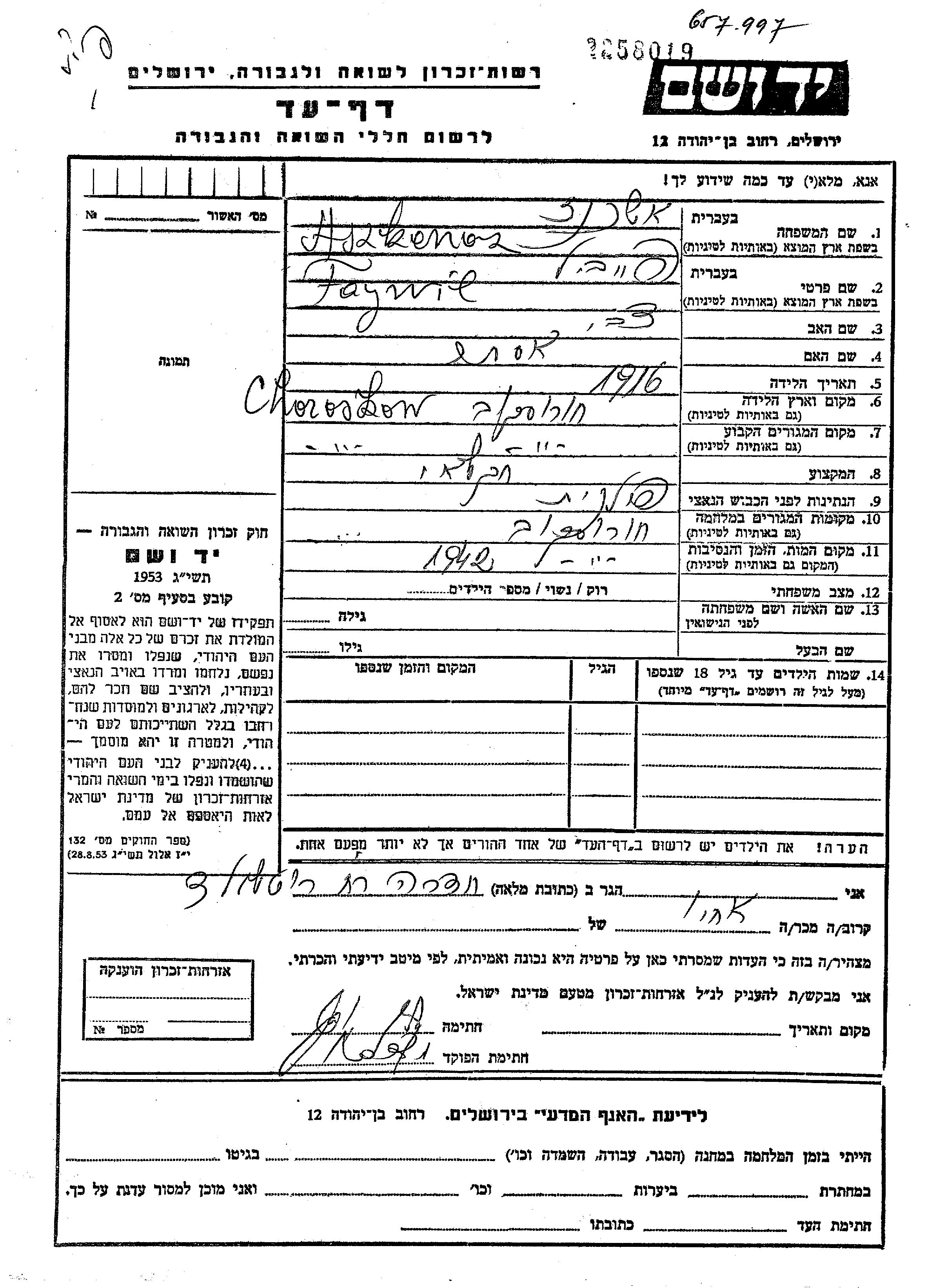 Faywil פייוול Aszkenaz נולד בChorostkow שבפולין בשנת 1916 לצבי ואסתר. הוא היה חקלאי. לפני מלחמת העולם השניה התגורר בChorostkow שבפולין. בזמן המלחמה הוא היה בChorostkow שבפולין. הוא נרצח בשואה. מקום המוות: Chorostkow שבפולין בשנת 1942.