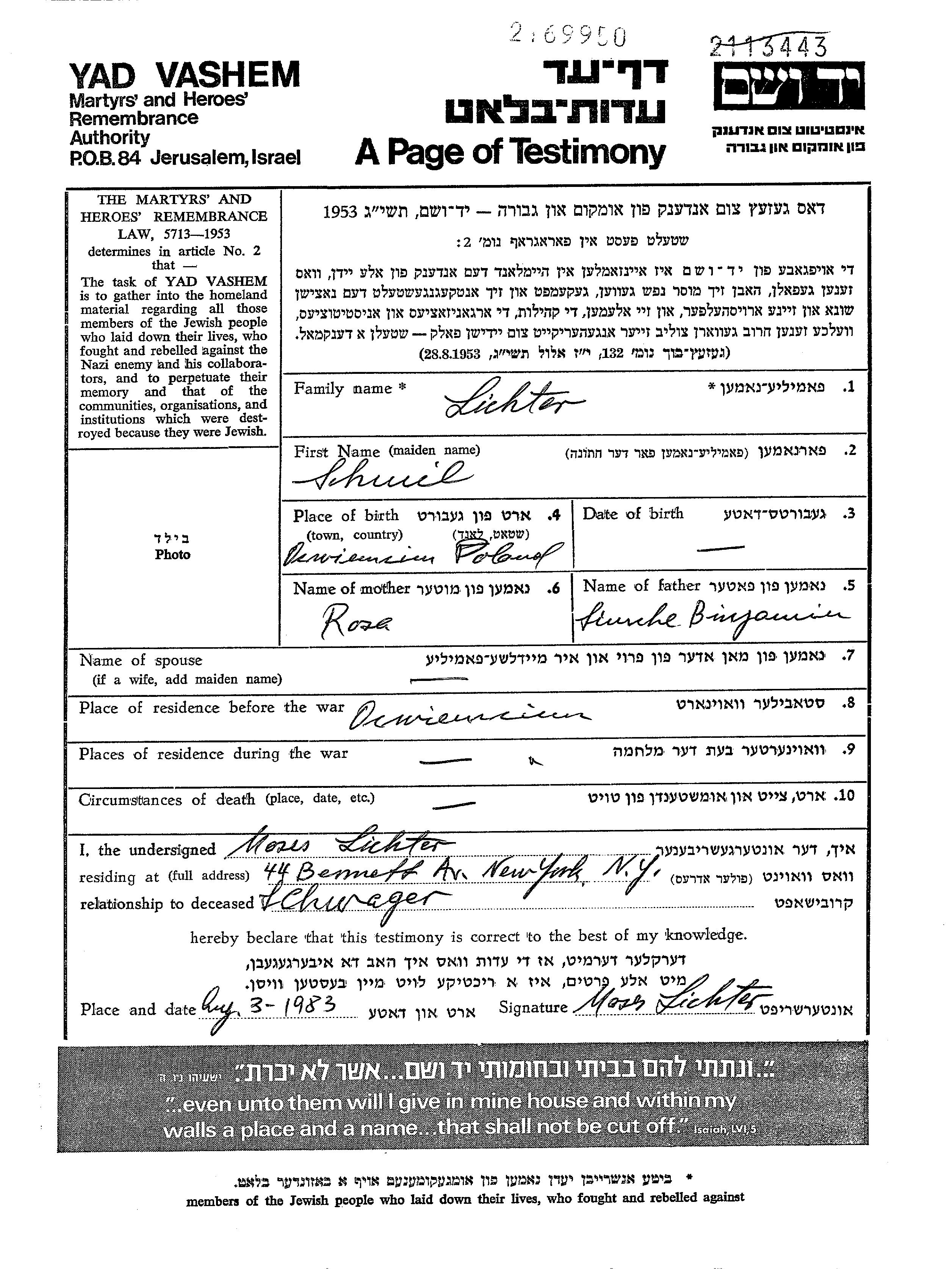 Schmil Lichter נולד בOświęcim שבפולין לSimche Binjamin ורוזה לבית ליפשיץ. לפני מלחמת העולם השניה התגורר בOświęcim שבפולין.