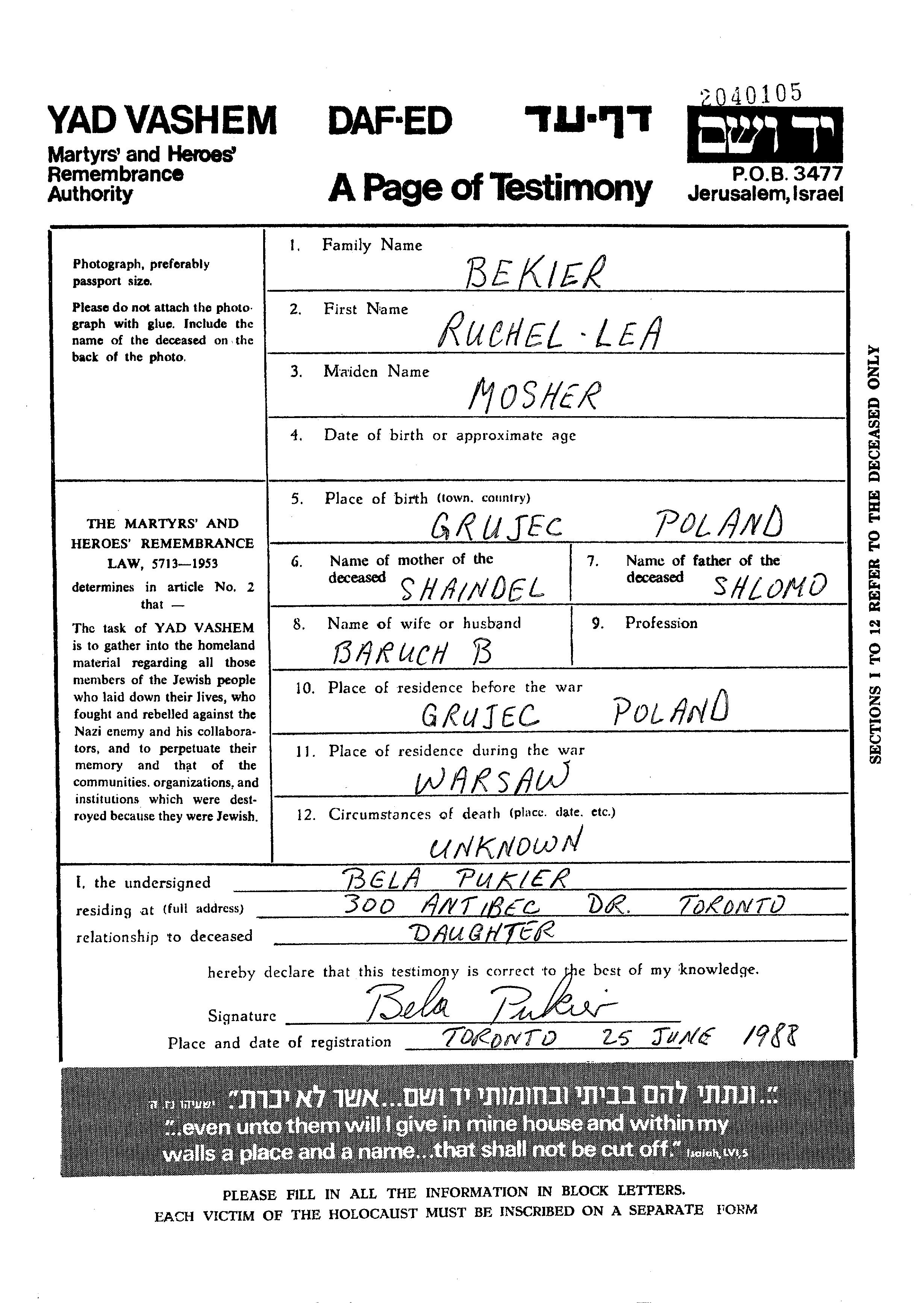Ruchel לאה Bekier לבית מושר נולדה בGrojec שבפולין לשלומה וShaindel. היא היתה נשואה לברוך. לפני מלחמת העולם השניה התגוררה בGrojec שבפולין. בזמן המלחמה היא היתה בWarszawa שבפולין.