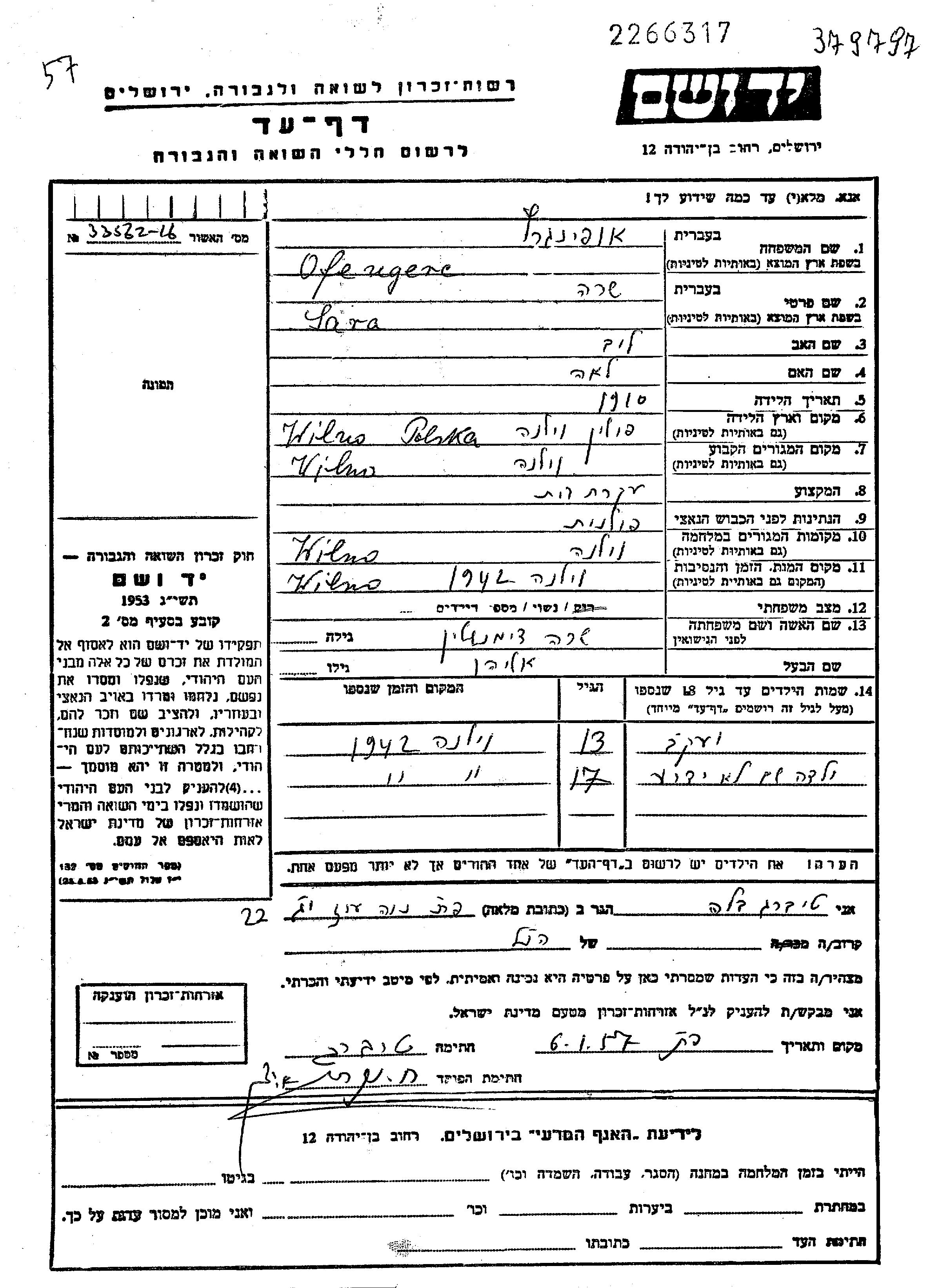 שרה Ofengerc לבית דימנשטיין נולדה בWilno שבפולין בשנת 1910 ללייב ולאה. היא היתה עקרת בית ונשואה לאליהו. לפני מלחמת העולם השניה התגוררה בWilno שבפולין. בזמן המלחמה היא היתה בWilno שבפולין. שרה נרצחה בשואה. מקום המוות: Wilno שבפולין בשנת 1942.