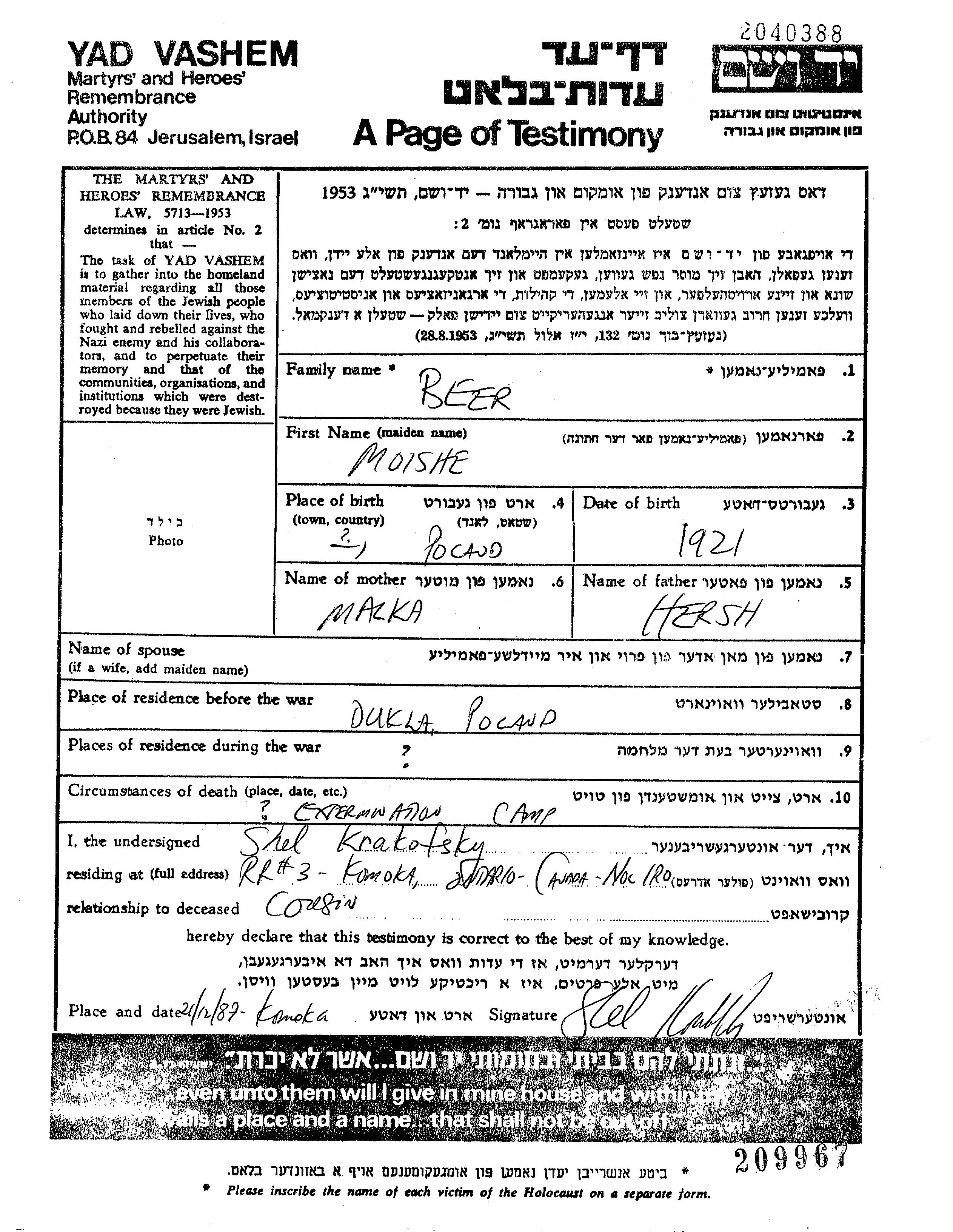 Moishe Beer נולד בפולין בשנת 1921 לHersh ומלכה. לפני מלחמת העולם השניה התגורר בDukla שבפולין.
